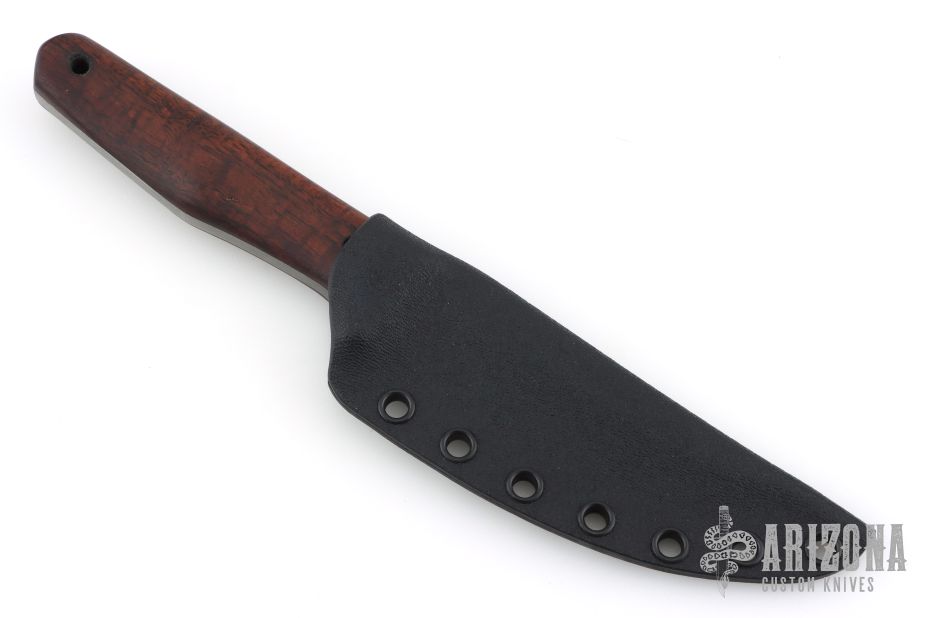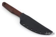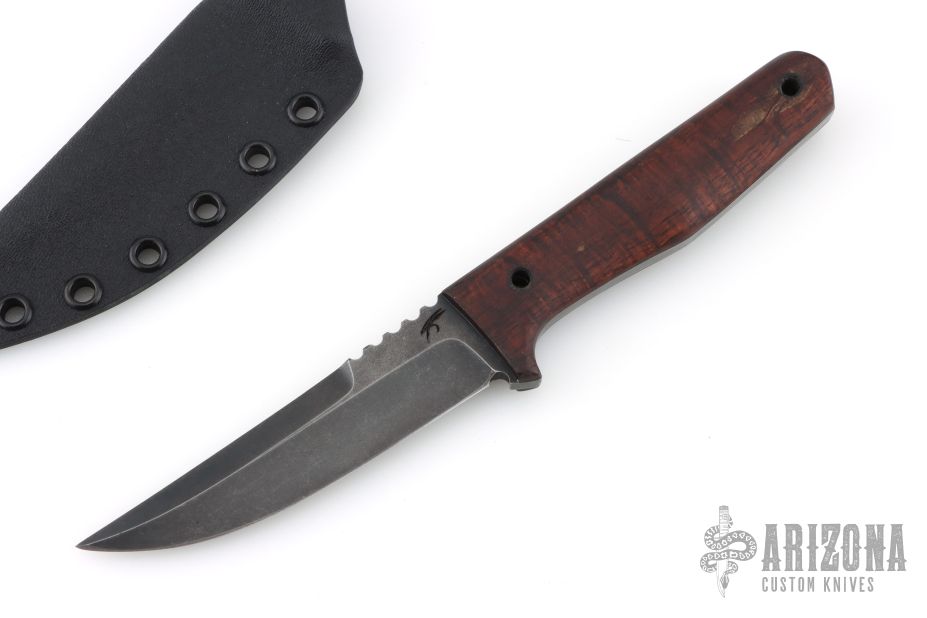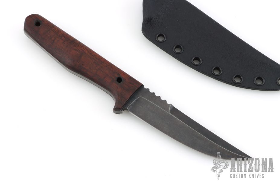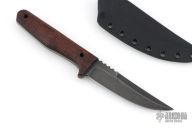This knife by Jason Knight features a blackwashed blade with false top edge and notched thumbrest, .2" blade stock and 1.042" blade depth, full tang construction. The handle has nicely shaped wood scales with black pin and lanyard hole. Comes with a kydex sheath. Has a couple light marks on the handle. Excellent condition.