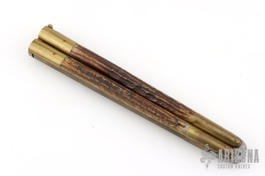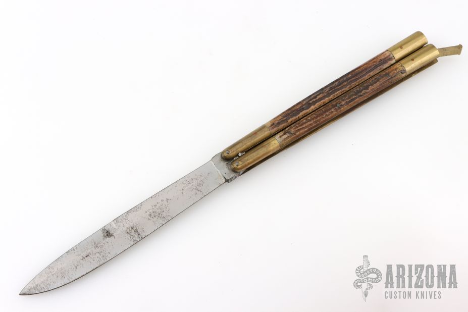 This balisong from the Philippines features a satin-finish drop point blade. The handle is constructed with an integral brass frame and jigged bone inlays. It shows scuffs, scratches, and patina from normal use, but overall the knife remains in good condition.