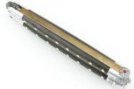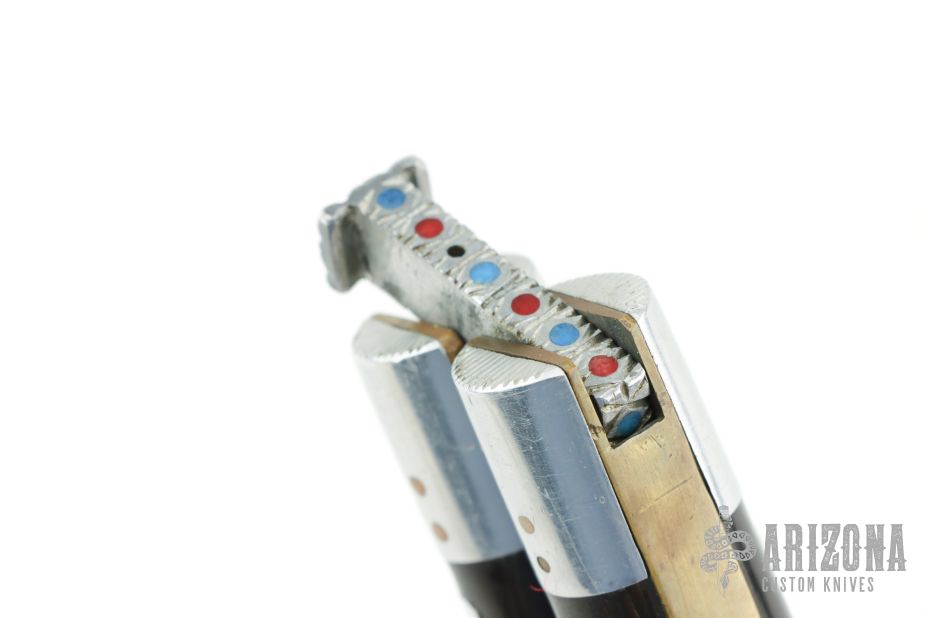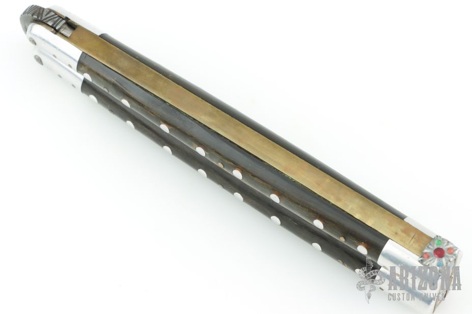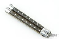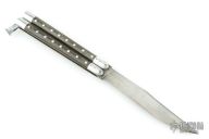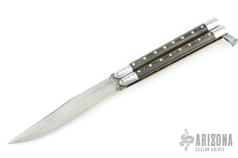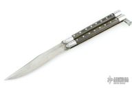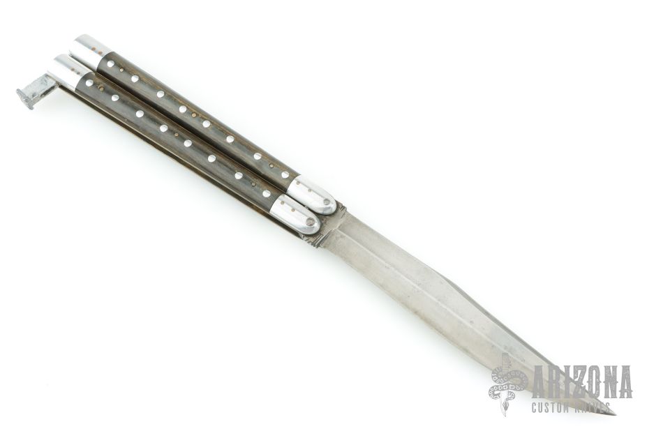This balisong from the Philippines features a clip point blade with a satin finish and false top edge. The handle has aluminum bolsters, brass frame and wood scales. Alumnium T-latch. Has scuffs, scratches and patina otherwise the knife is in good condition.