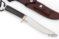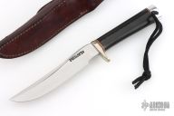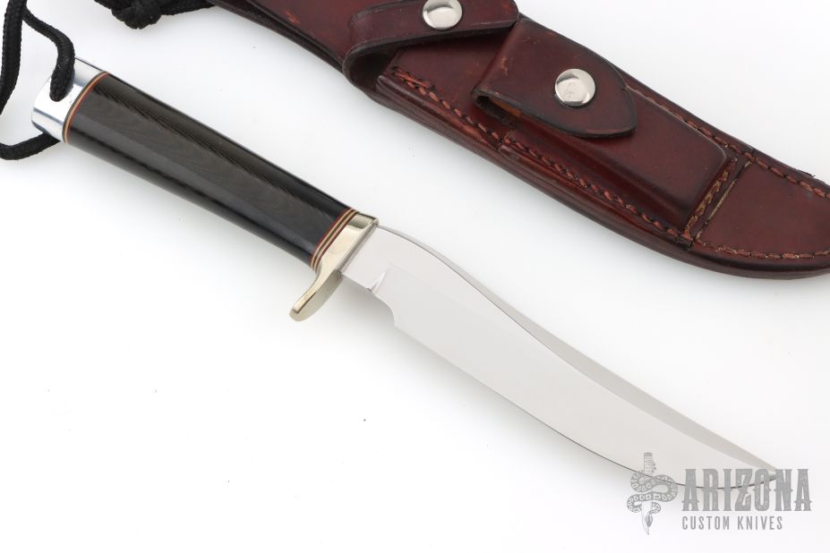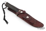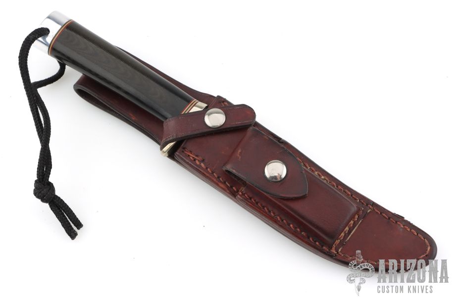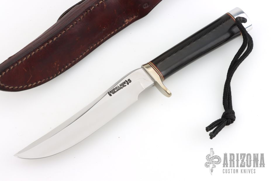 This Model 3-6 by Randall features a satin finished stainless steel blade with .214" blade stock and 1.128" blade depth, hidden tang construction. The handle has a nickel silver guard and a duralumin butt with lanyard hole, black linen micarta grip with red/white/blue spacers. Comes with a brown leather sheath. Has a few light scratches, otherwise excellent condition.