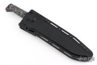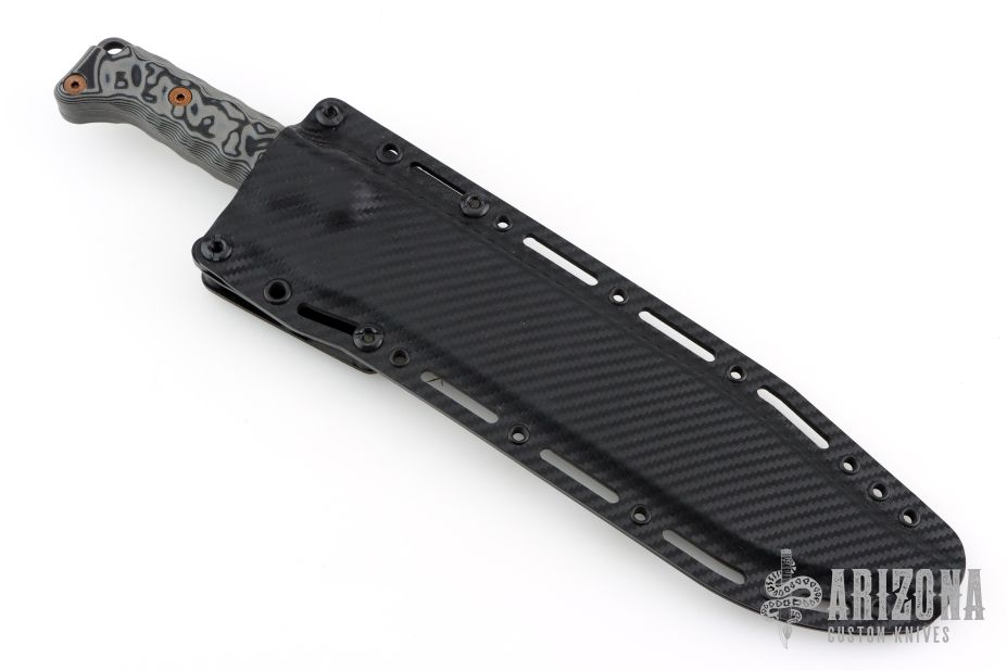This Holdout by Dawson Knives features a midnight finished blade with notched thumbrest, .202" blade stock and 1.552" blade depth, full tang construction. The handle has gray/black G-10 scales. Comes with a CF kydex sheath and original box and papers. Excellent condition. #54