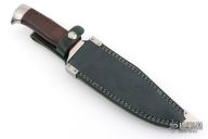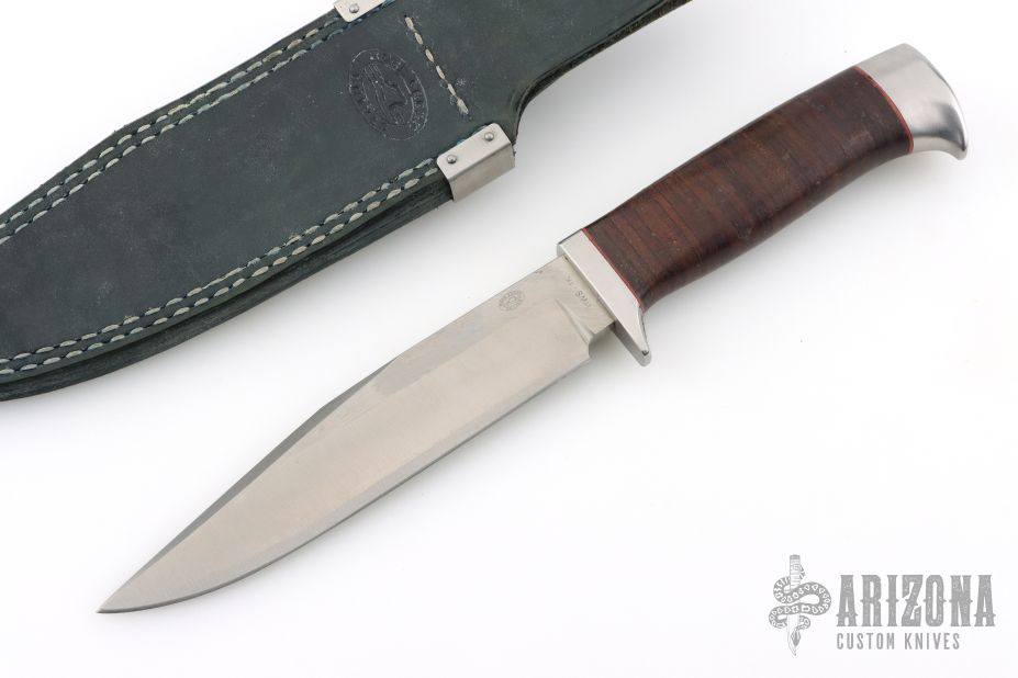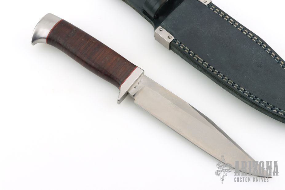 This knife by Dalian and Rock Creek Knives features a satin finished blade with false top edge, .239" blade stock and 1.181" blade depth, hidden tang construction. The handle has a stainless steel guard and butt with a stacked leather grip, red spacers. Comes with a black leather sheath with steel fittings. Has some light scratches, otherwise good condition.