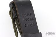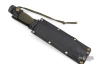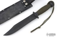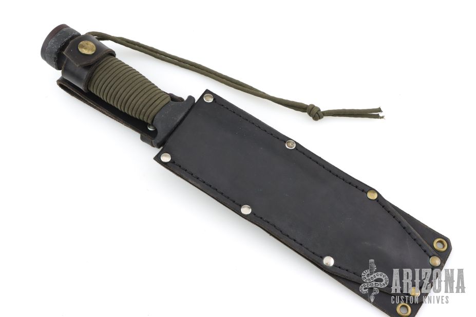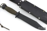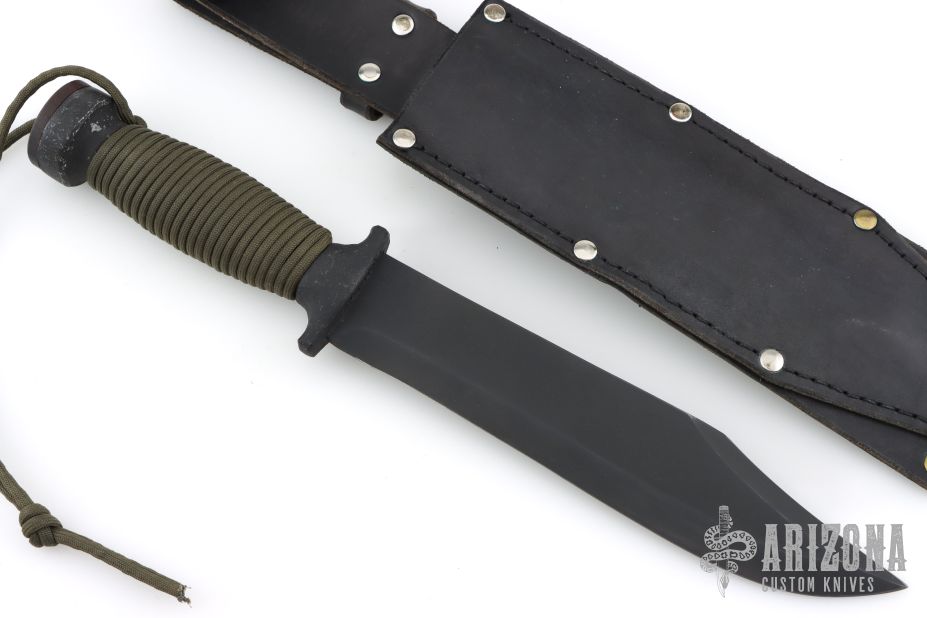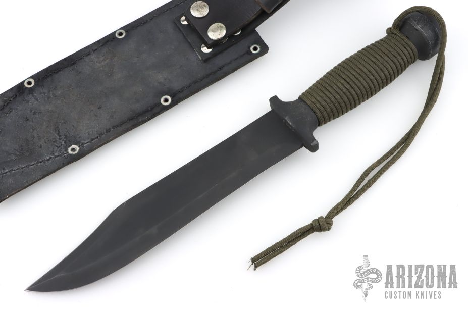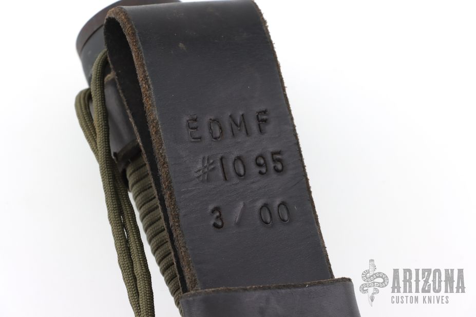 This fighter by EDMF (Eight Dollar Mountain Foundry) features a black blade with sharpened top edge, .191" blade stock and 1.790" blade depth, hidden tang construction. The handle is cast, coated black handle with cord wrap. Comes with a black leather sheath. Has some light scuffs/scratches, but otherwise excellent condition. This knife is dated 3/00 and #1095