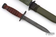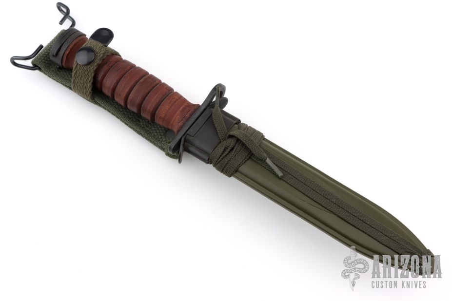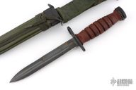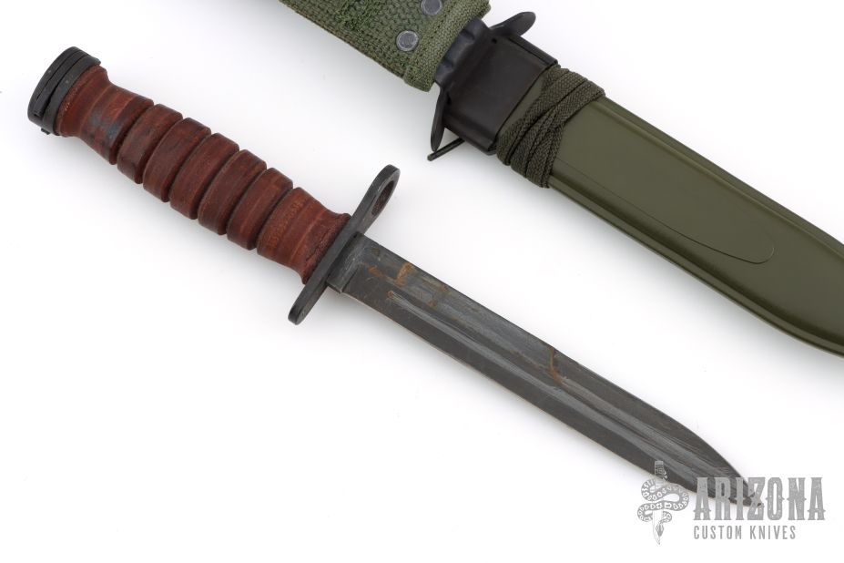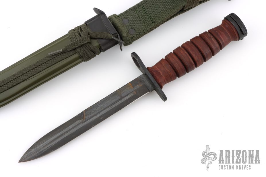 This US M-4 from Camillus Knives has a black bayonet style blade with sharpened top edge, .186" blade stock and .846" blade depth, hidden tang construction. The handle has a black steel guard and butt with stacked leather handle. Comes with USM8A1 sheath. Has scuffs, sceratches, and has been resharpened. Good overall condition.
