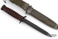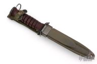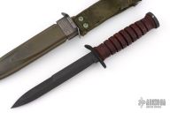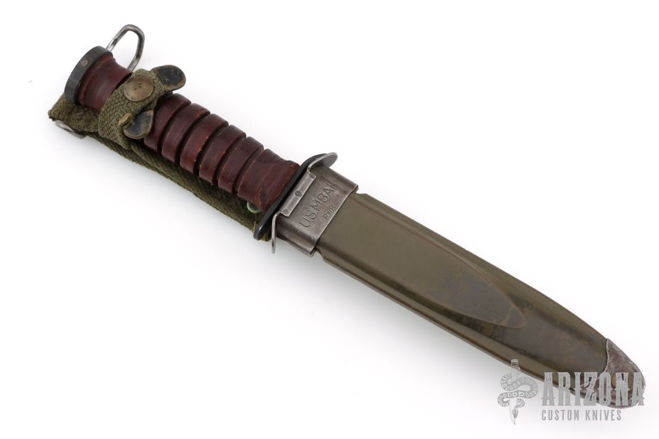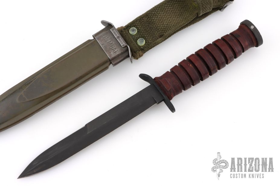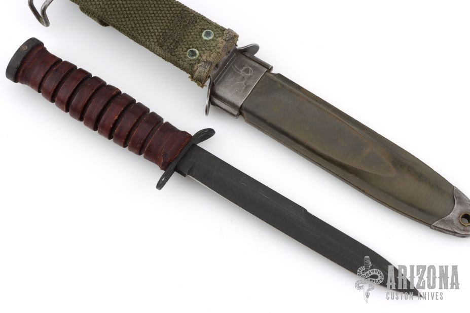 This M3 from Camillus Knives features a black bayonet ground blade with sharpened top edge, .191" blade stock and .859" blade depth, hidden tang construction. The handle has a black steel guard and butt, and a stacked leather grip. Comes with M8A1 sheath. Has some scuffs/scratches, great overall condition. The guard is stamped US M3 Camillus, and the tang is stamped with the Ordnance flaming bomb (flaming circle).