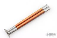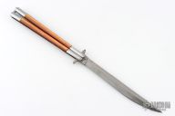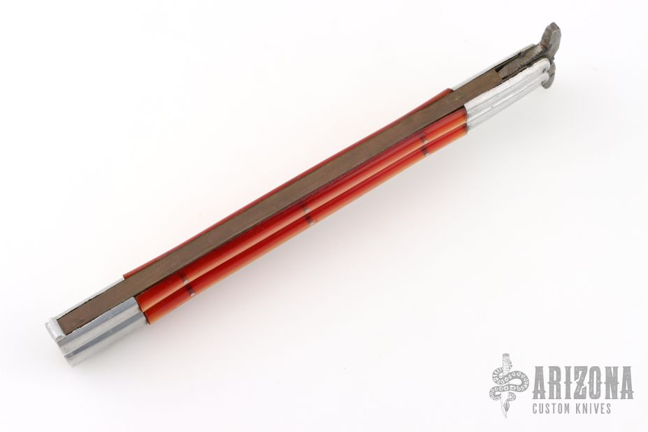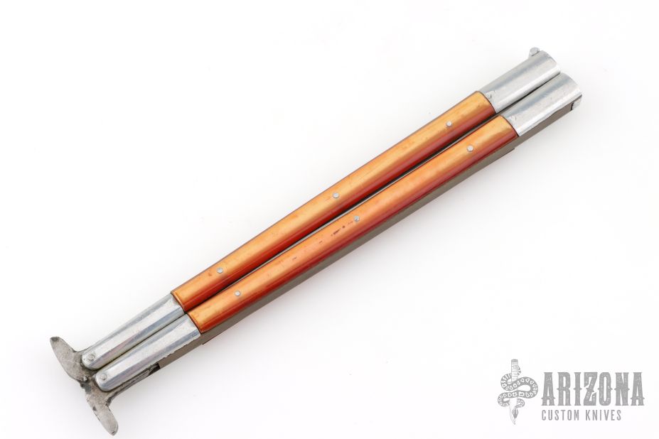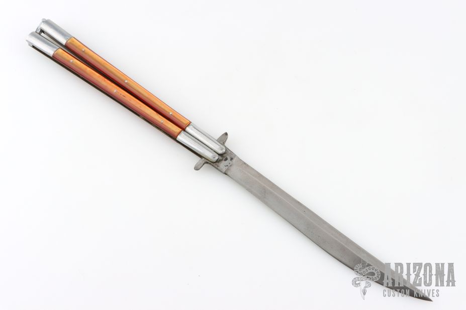 This balisong from the Philippines features a clip point blade. The handle has aluminum bolsters, orange scales, aluminum T-latch. Btass frame. Has a scratches and patina, otherwise good condition.