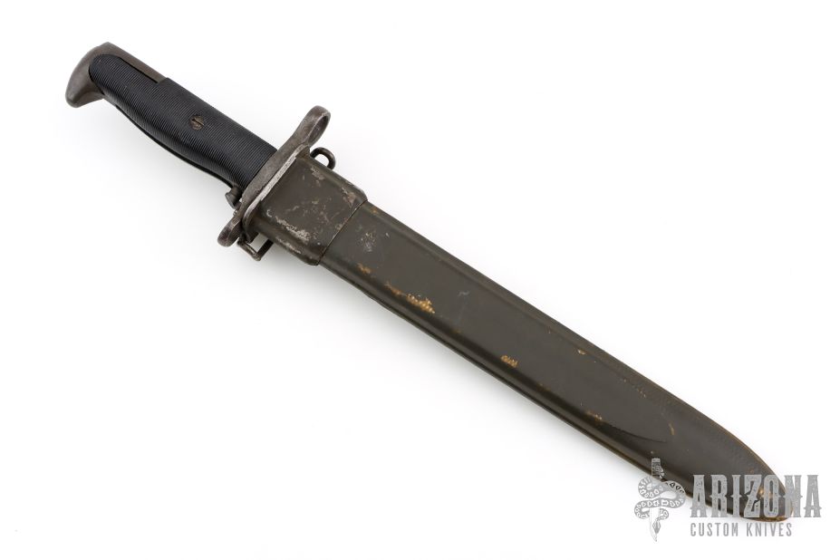 This WWII Era M1 Garand Bayonet from Wilde Drop Forge & Tool features a spear point blade with fuller. The handle is comprised of a stainless steel guard and black handles over steel tang. Includes fiberglass sheath with steel throat. Light oxidation on guard, pommel and sheath. Scratches on guard and blade. This piece of history definitely shows its age. Good condition otherwise.