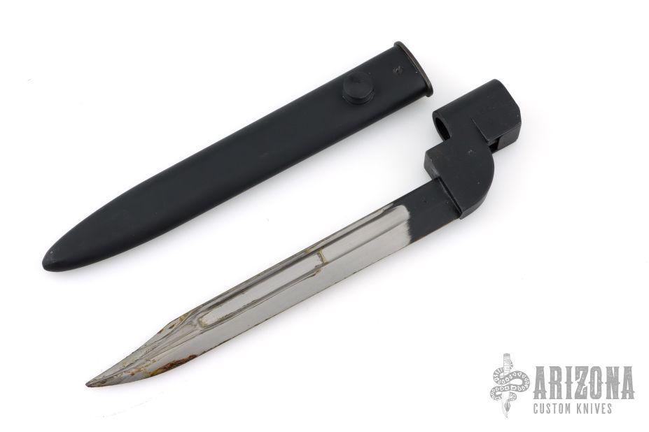 British No.9 MK-I Socket Bayonet. Has fullers, .251" blade stock and .951" blade depth, full tang construction. Steel guard and butt. Has pitting, patina, scratches, scuffs. "Broad Arrow" accepting stamp as well as D-54. Great overall condition.