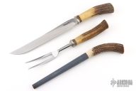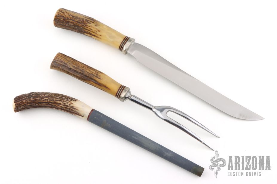 "Designed to meet every requirement as the ideal table knife, it is rustproof and will resist staining as ordinary blades do when used in carving meat. Complete with high-quality stag handled Sharpening Steel and Fork. A three-compartment felt case is included. "
