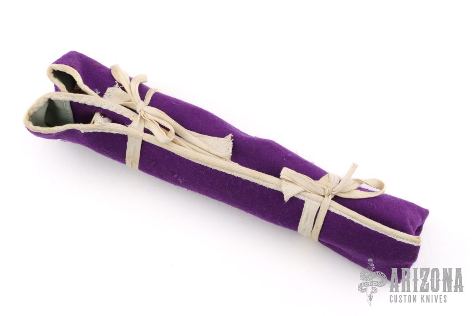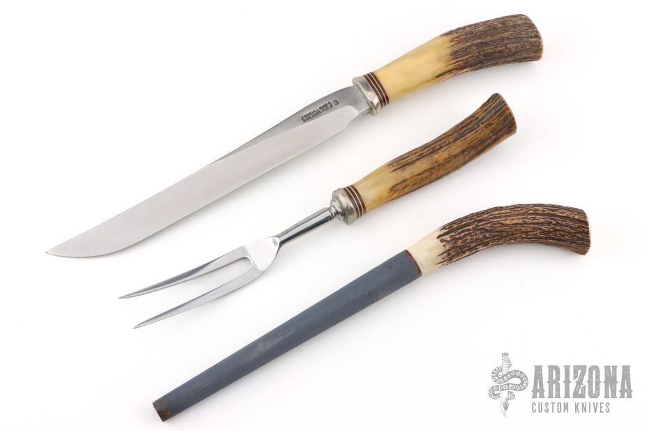 This vintage carving set by Randall Made Knives features a satin finished blade with .172" blade stock and 1.107" blade depth, hidden tang construction. Nickel silver guards with stag grips and red/white/blue spacers. Comes with matching fork with stag handle, sharpening stone w/ stag handle, and vintage cloth rollup. Has some light scratches, otherwise excellent condition for its age. Has a "Separate S" makers mark making it roughly 1965-1969