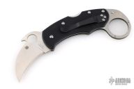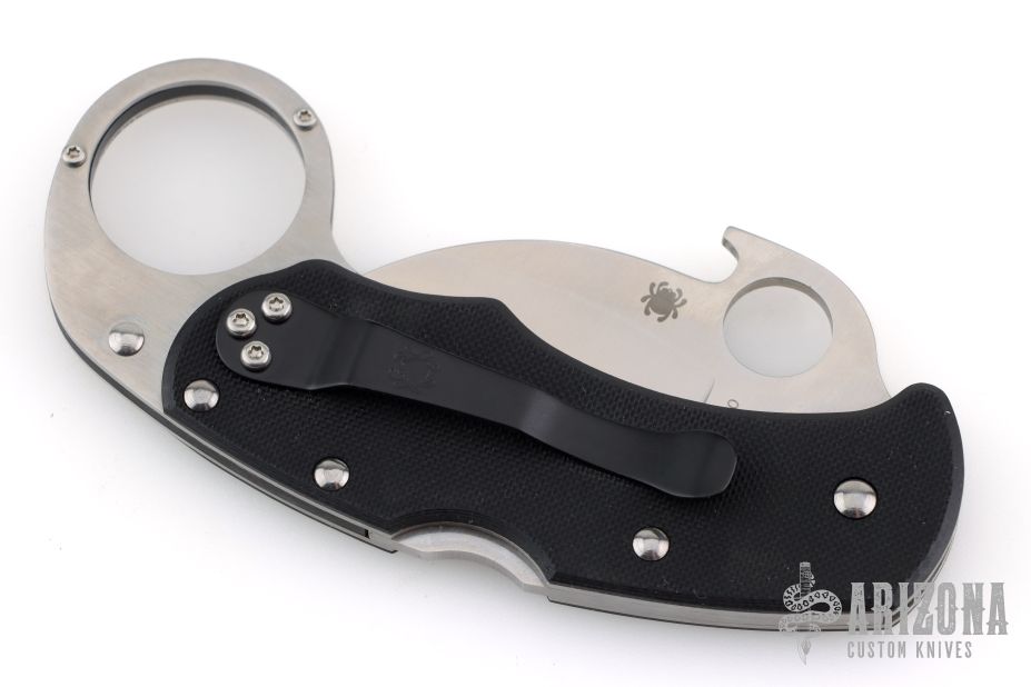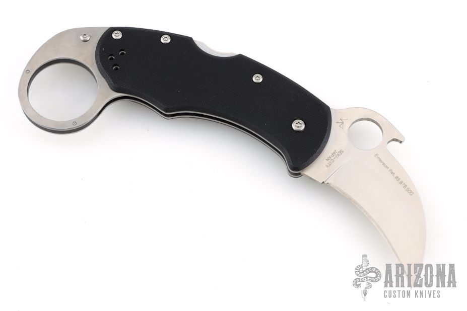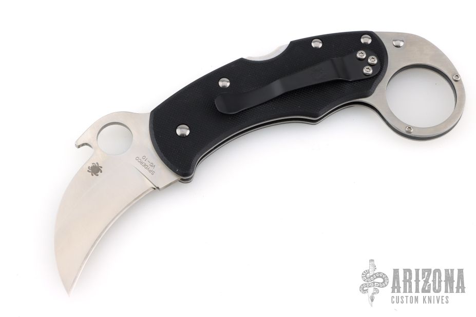 This Karahawk by Spyderco features a satin finished hawkbill blade with thumbhole and wave feature. The handle has black G-10 scales with stainless steel liners and backspacer, tip up black stainless clip, left or right reversible. Comes with original box and papers. Excellent condition.