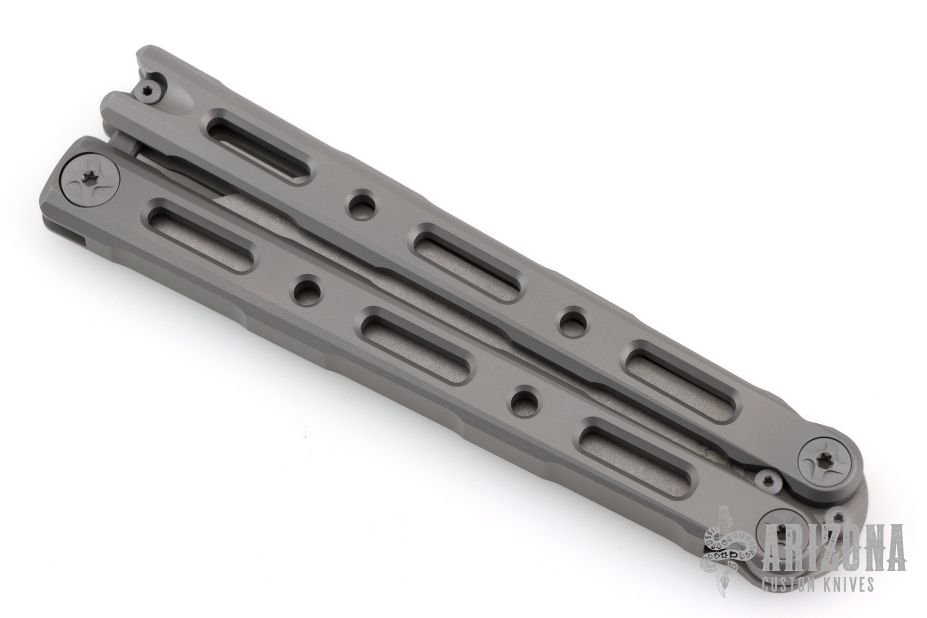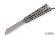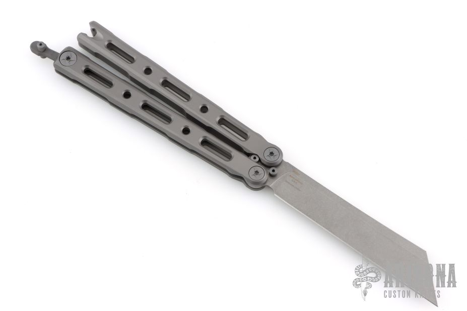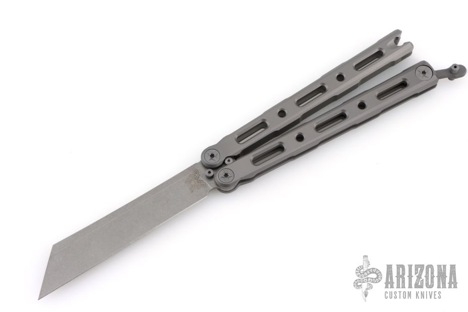 This Model 87 Balisong by Benchmade features a tumble finished wharncliffe style blade. The handle has an integrally constructed, skeletonized titanium frame with bead blast finish. Spring-loaded T latch on pommel. Comes with original box, papers, pouch, and slip sheath. Excellent condition.