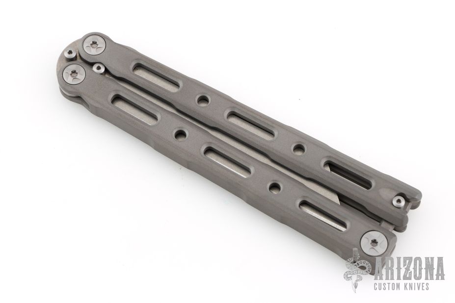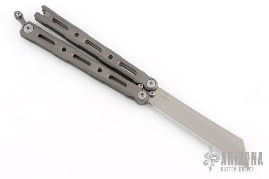 This Model 87 Balisong by Benchmade features a tumble finished wharncliffe style blade. The handle has an integrally constructed, skeletonized titanium frame with bead blast finish. Spring-loaded T latch on pommel. Comes with original box, papers, pouch, and slip sheath. Excellent condition.