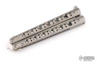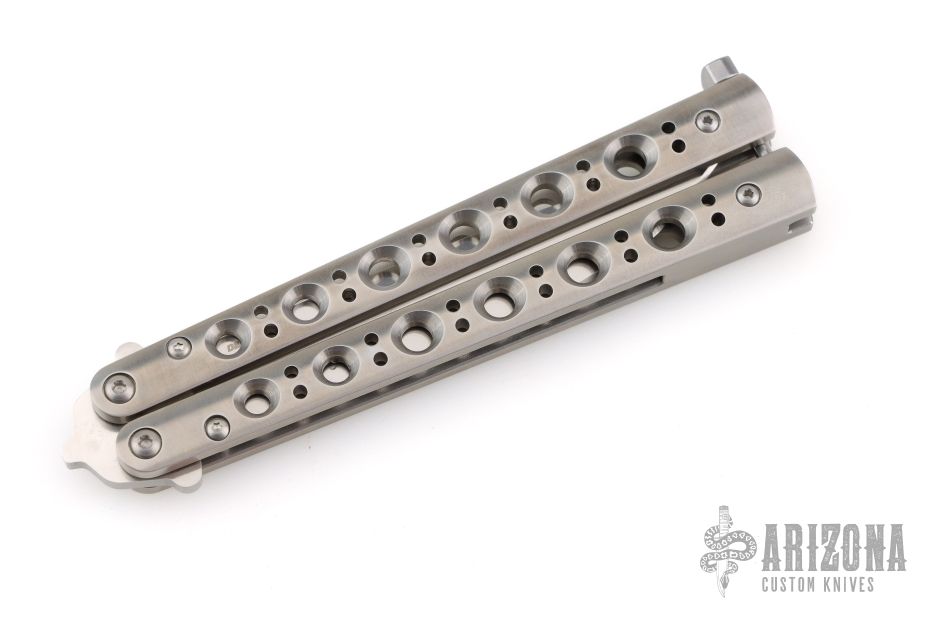 This Model 62 Balisong by Benchmade features a stonewashed spear point D2 blade with a false top edge. The handle has stainless steel handles and latch. Includes the original box, papers and nylon sheath. Excellent condition.