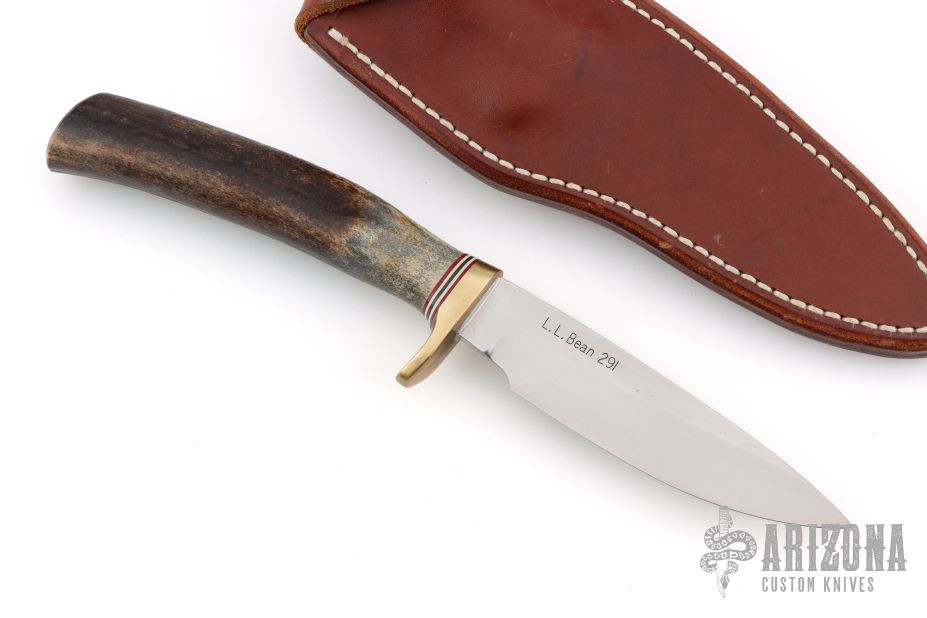This LL Bean Special by Randall Made Knives was made for LL Bean and is #291. It has a satin finished blade, .160" blade stock and .911" blade depth, hidden tang construction. The handle has a brass guard, stag grip and red/white/blue spacers. Comes with a brown leather sheath. Comes with a Randall zippered case. Excellent condition. The collaboration with L.L. Bean primarily occurred during the late 1980s and early 1990s.