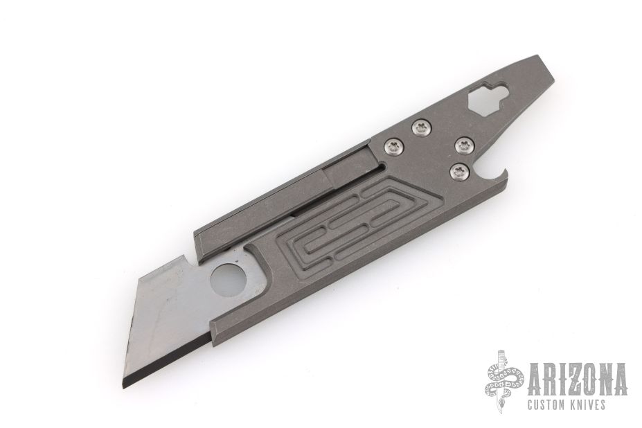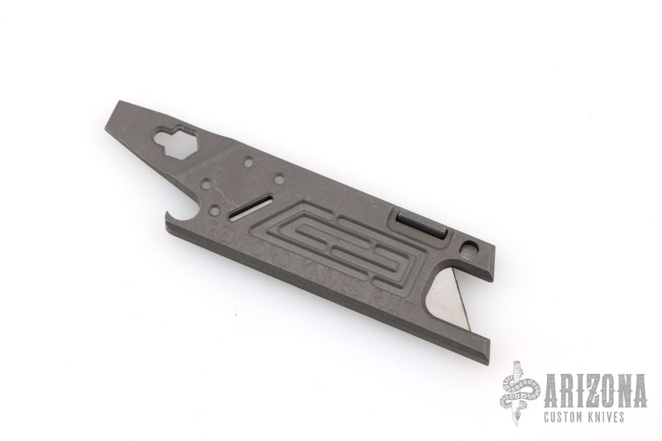 This Rexford RUT (Rexford Utility Tool) from Todd Rexford uses a standard utility razor blade. Blade can easily be replaced. This piece features a functional lanyard hole, flat head screwdriver/pry tip, and bottle opener. Has some scuffs and scratches, great overall condition.