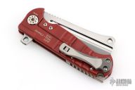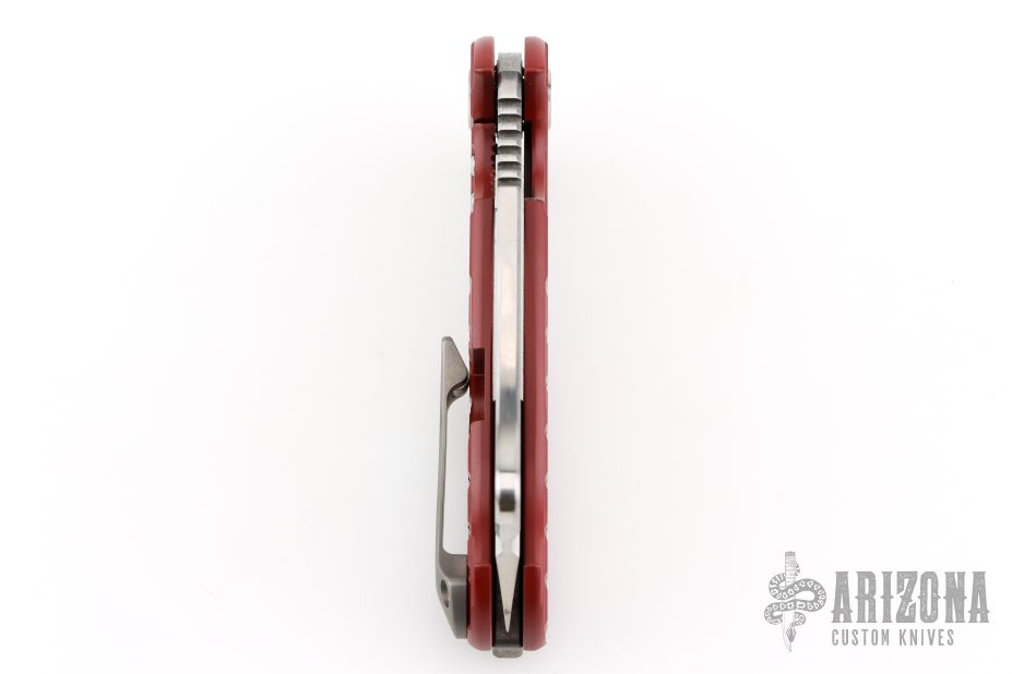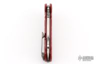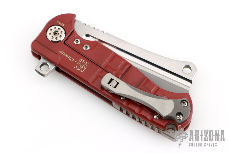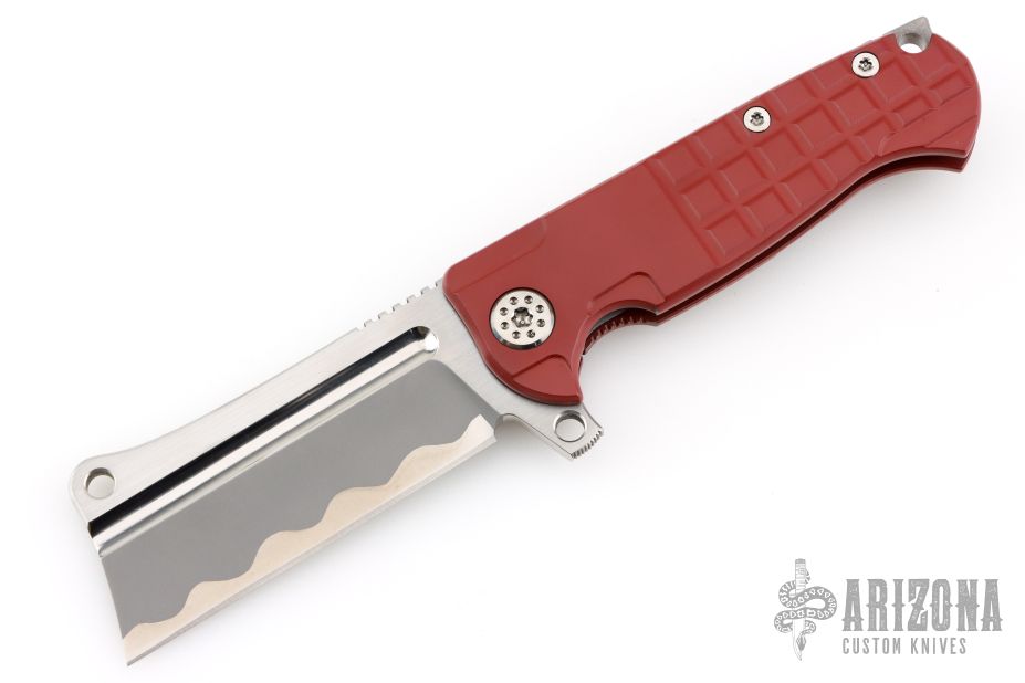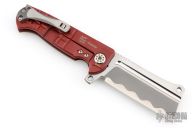 This ADV Mini Cleaver framelock flipper by Andre De Villiers features a two-tone bead blast/satin finished blade with notched flipper and thumb rest. Handle has a red cerakoted titanium frame, matching titanium back spacer and two-tone finished titanium clip with roller. Nice smooth action, detent, lockup and blade seating. Comes with Maker's zipper case. Excellent condition.