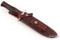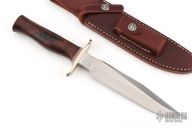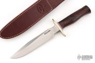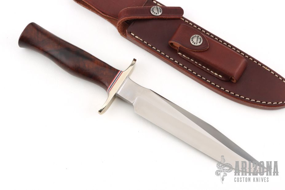 The Model 1 was made famous by Allied combat troops in World War II and has since been widely used in all theaters of war. It has a satin finished blade with sharpened top edge, .240" blade stock and 1.253" blade depth, hidden tang construction. The handle has a nickel silver guard, desert ironwood grip with red/white/blue spacers. Includes a brown leather sheath. Excellent condition. Comes with a zippered case.