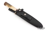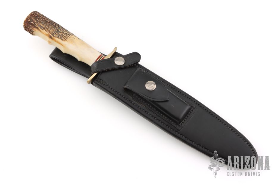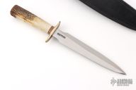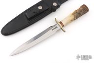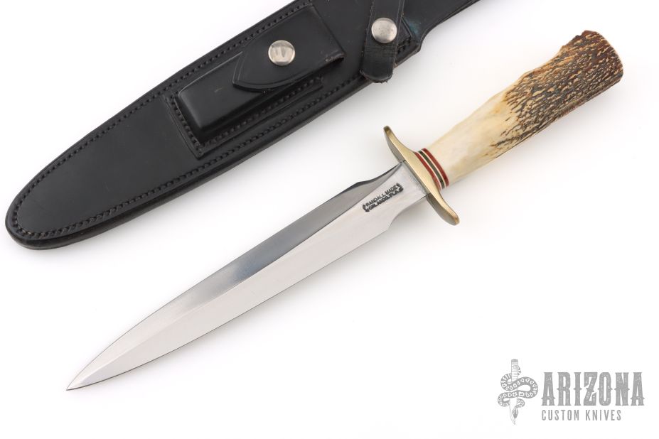 The Model 2-8 by Randall Made Knives is a heavily made dagger or dirk. The handle has a brass guard, stag grip with finger grooves, red/white/blue spacers. Double-edged satin finished blade, .209" blade stock and 1.246" blade depth, hidden tang construction. Comes with a Johnson rough back black leather sheath with baby dots. Has a couple light scratches, otherwise excellent condition.