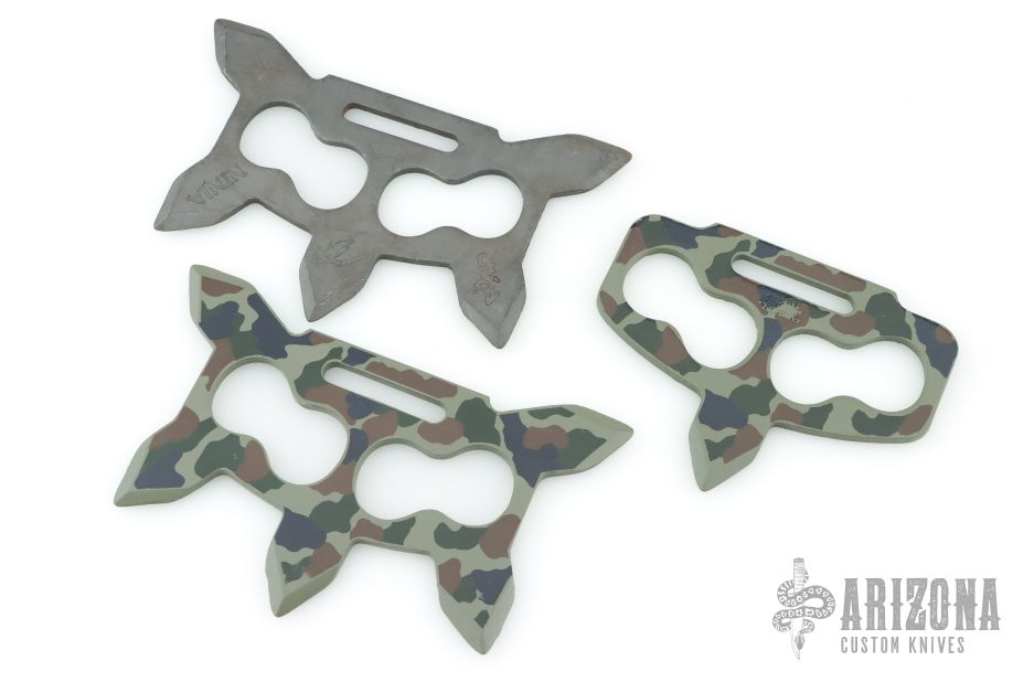 Ninja Knuckle by Valor. Black steel knuckle and camo, .159" thick. Has scuffs/scratches otherwise all 3 are in excellent condition.