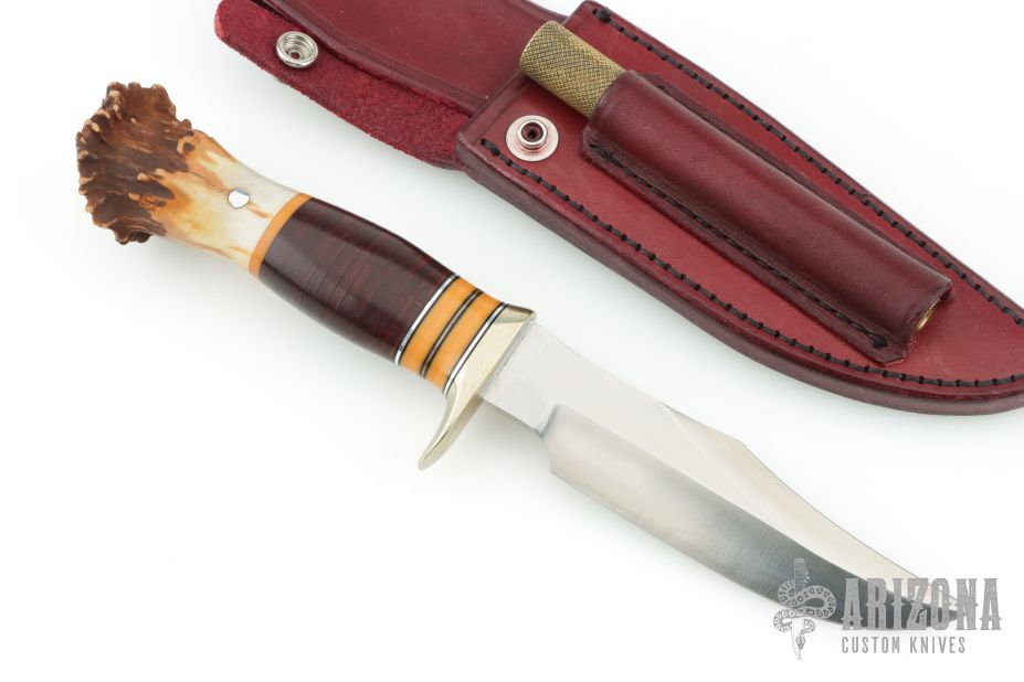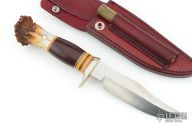 This Stanaback Special by Randall Made knives has been given a Scagel style handle by James Behring. It features a satin finished blade with sharpened top edge and notched thumbrest, .226" blade thickness and 1.133" blade depth, hidden tang construction. The handle has a nickel silver guard, crown stag butt with aluminum pin, black/duralumin/vintage micarta/stacked leather spacers. Includes a maroon leather sheath with sharpening steel. Excellent condition. Very cool, very unique. One of a Kind!