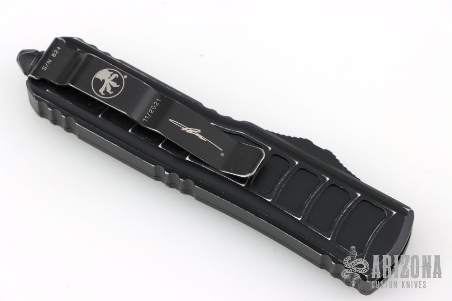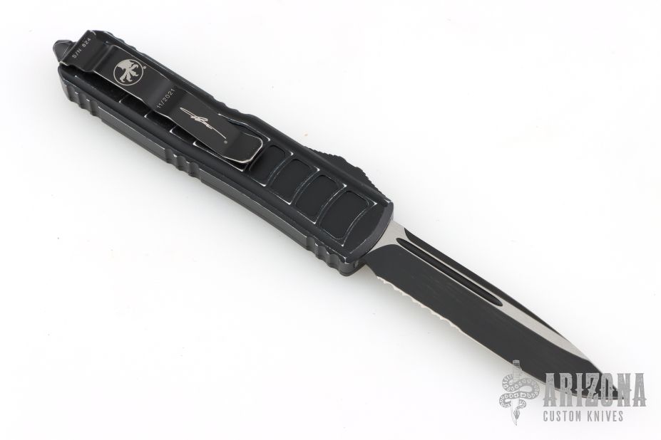 This UTX-85 ii by Microtech features a two-tone partially serrated blade. The handle has a black aluminum frame with black hardware and tip down stainless steel clip. Comes with original box and papers. Dated 11/2021 and S/N 824. The edges of the frame have been softened and the frame has a two-tone finish from carry, otherwise good condition.