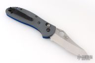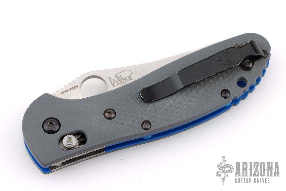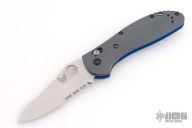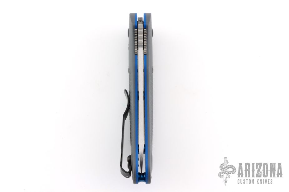 This Griptilian 550-1 by Benchmade features a stonewashed partially serrated blade with swedge, notched thumbrest and dual thumbstuds. The handle has textured grey G-10 scales with blue G-10 liners, blue anodized barrel spacers. The pocket clip can be reversed for right or left tip up carry. The AXIS lock system makes the knife easy to open and easy to close. Excellent condition. Comes with a Benchmade box and papers for a different model.