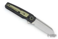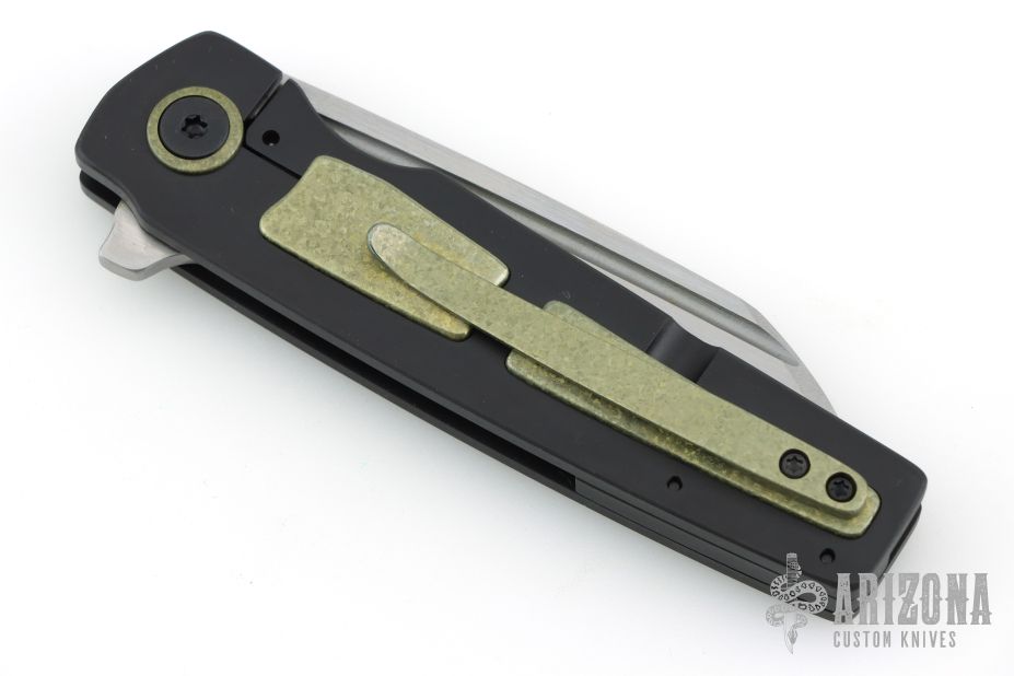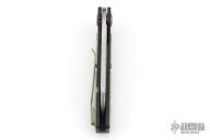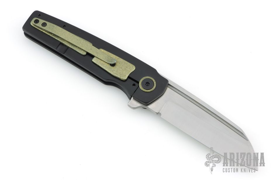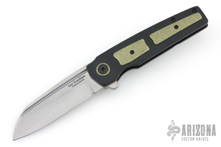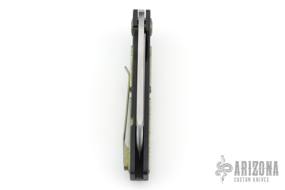This Baby Hognose framelock flipper by Les Voorhies features a satin finished blade with fuller, flipper, and caged bearings. The handle is comprised of black scales with yellow anodized crystal titanium overlays and matching tip up pocket clip. Black backspacer. Comes with original laser engraved wooden box. Excellent condition.