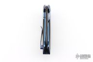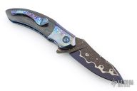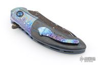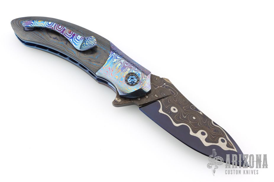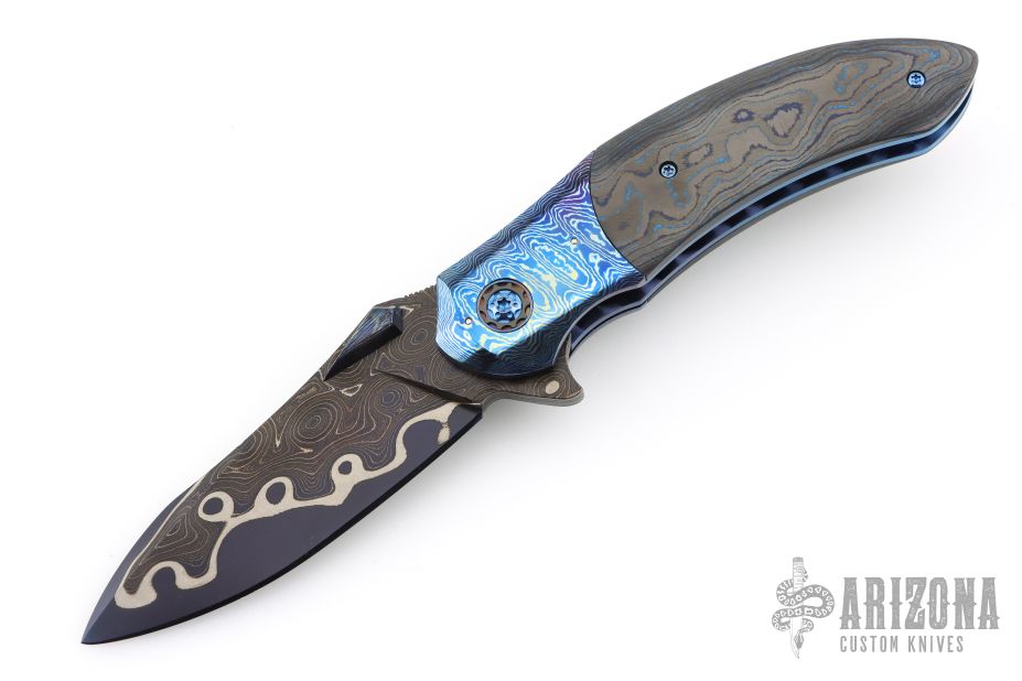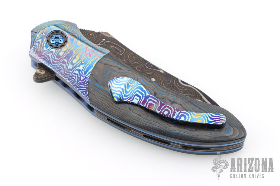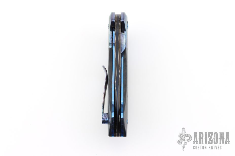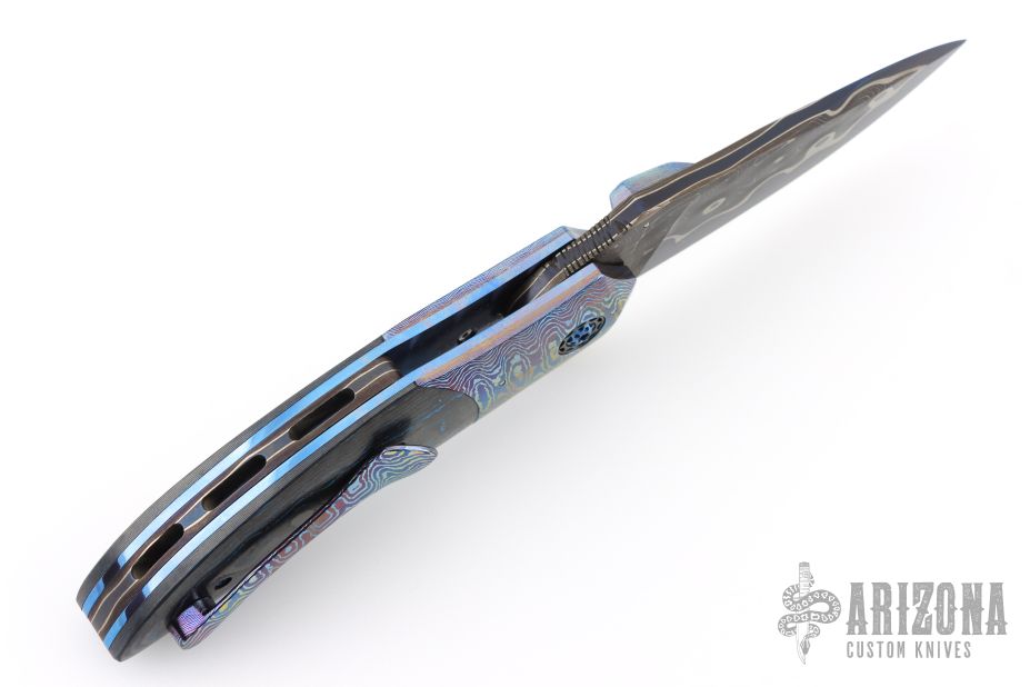 This knife by Peter Martin features a sole-authored frost blued lava lamp Damascus blade with a thumb-lug and a flipper. The handle has Nichols Ladder mokuti bolsters, blue Fat Carbon scales, anodized/jeweled titanium liners, matching Damascus, ported, backspacer, and a tip up Mokuti clip with hidden screws, anodized titanium pivot, zirc and titanium pivot collars. Nice detent, lockup and blade seating. Excellent Condition.