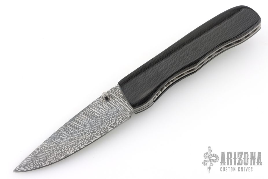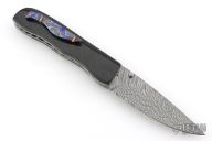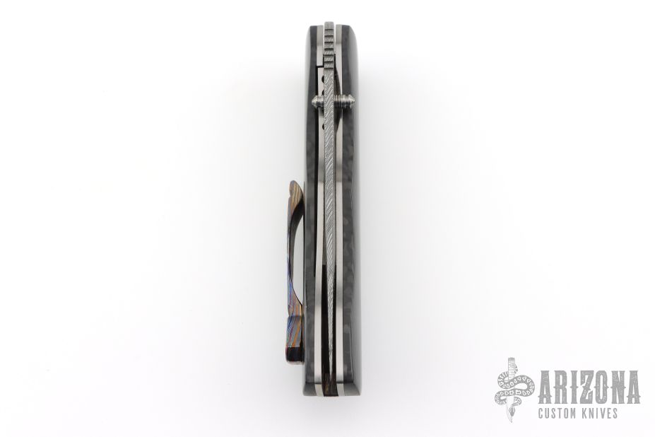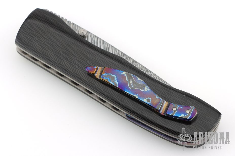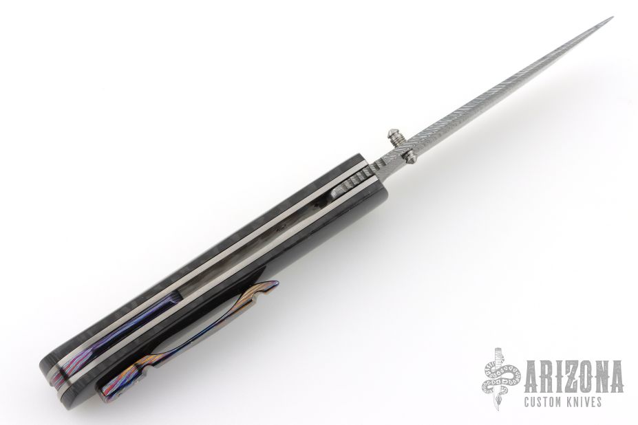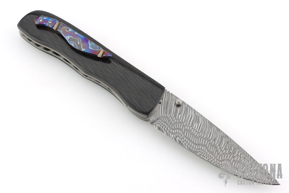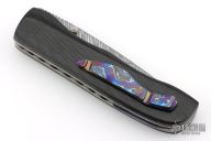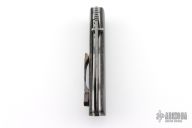 This Honey Creeper by KC Gray features a spear point Damasteel (Fafnir pattern) blade with thumb studs and notched thumb rest. The handle has linear carbon fiber covers, polished titanium liners, jeweled interiors, Zircuti backspacer and tip up clip. Nice detent, lockup and blade seating. Rides on bearings. Comes with zippered case and COA dated 5-25. Excellent condition.