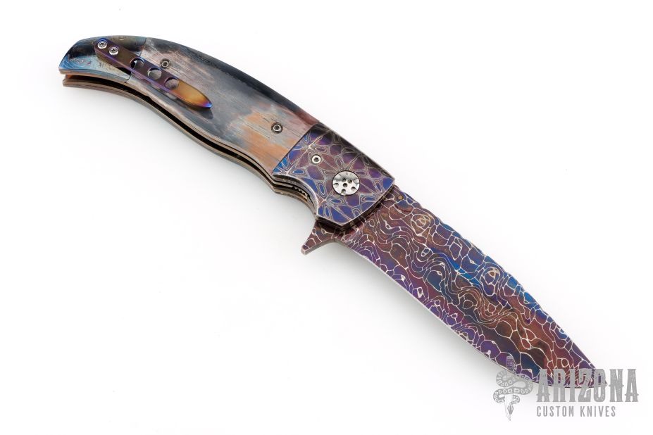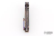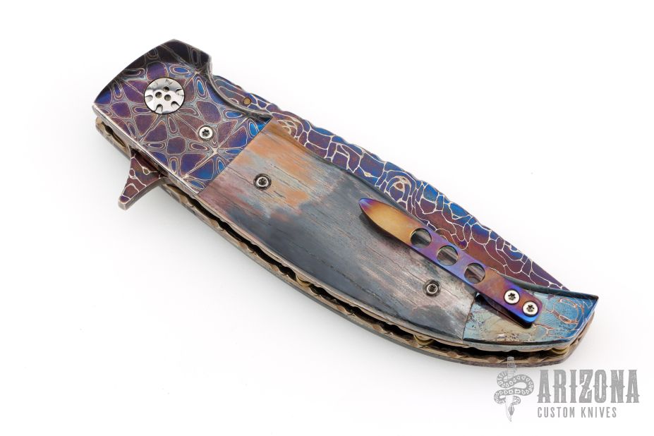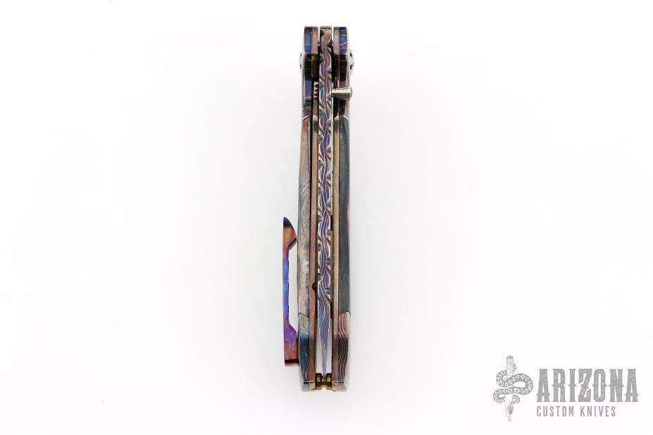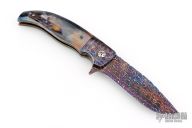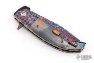This Flipper from Butch Ball features a Damascus blade with file-worked thumb rest, single thumbstud, and flipper. The handle is comprised of dovetail Damascus bolsters, front and rear, mammoth scales, anodized titanium liners, tip up titanium clip. Rides on bearings, nice detent and lockup. Comes in a zipper case. Excellent condition.
