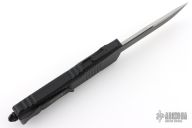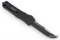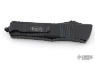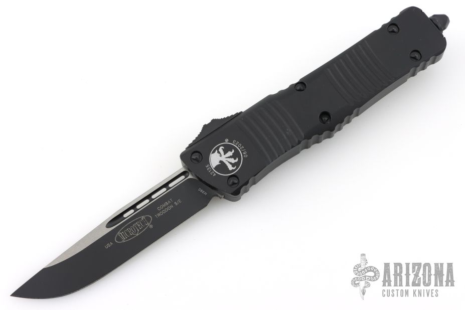 This Combat Troodon OTF automatic features a black S/E blade. Black aluminum handle with black stainless steel clip, tip down carry and all black hardware and glass breaker. Serial number 42135 and dated 06/2023. Comes with original box and papers. Has some minor wear on the edges of the clip, otherwise excellent condition.
