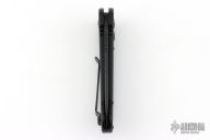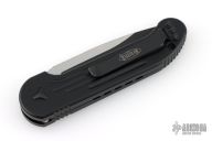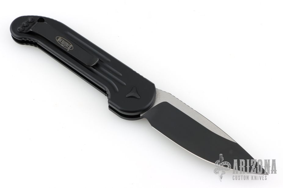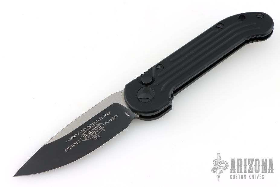 This LUDT side opening automatic by Microtech has a two-tone black blade with a standard edge and a black aluminum frame. This tactical version has black fittings. Stainless steel clip. Dated 06/2023 and serial number 32803. Comes with original box and papers. Excellent condition.