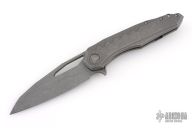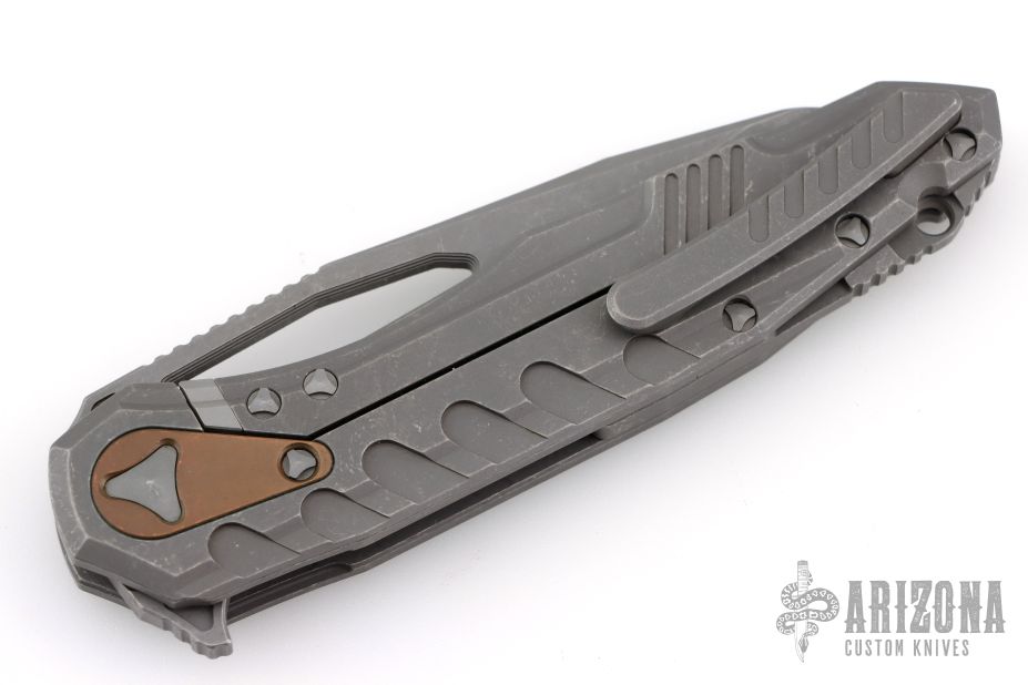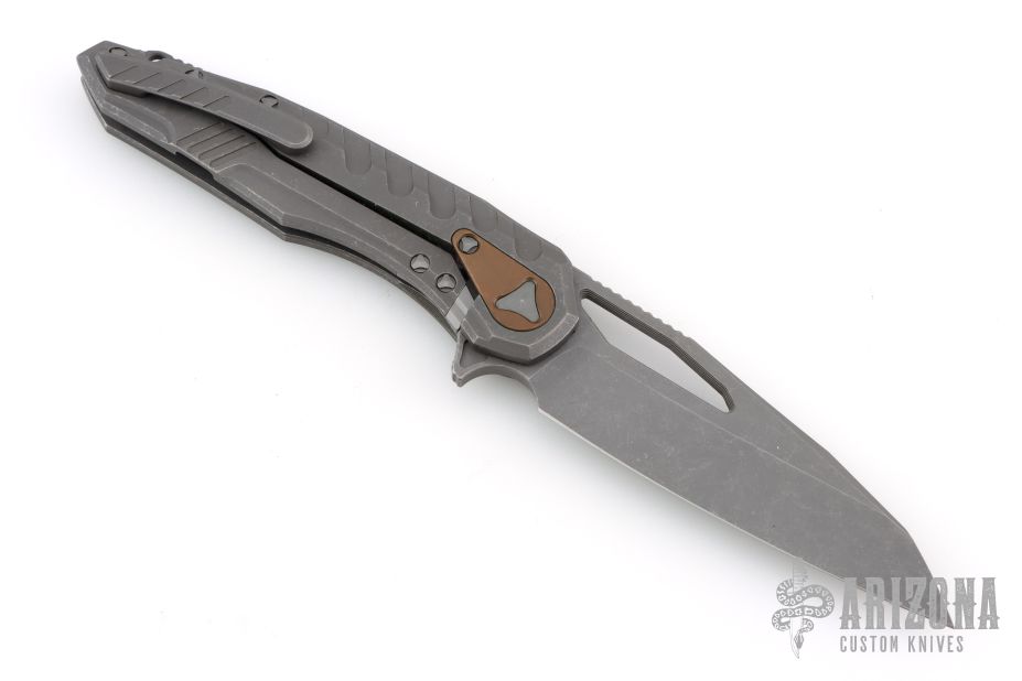 This Sigil MK6 by Microtech Knives features an Apocalyptic finished blade with thumb hole and flipper, notched thumbrest. The handle has an Apocalyptic finished titanium frame, tip up clip and backspacer with a distressed copper overtravel stop, stainless lockface insert. Comes with original box and papers. S/N 0415 and dated 02/2017. Excellent Condition.