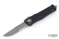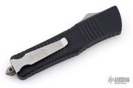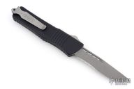 This Combat Troodon OTF automatic features an Apocalyptic finished S/E blade with a partially serrated edge. Black aluminum frame, stainless steel clip, tip down carry. Glass breaker. Serial number 18105 and dated 07/2017. Comes with original box and papers. Has some light scuffs, otherwise excellent condition.