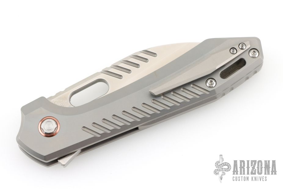 b. The bright version has a satin-finished blade; its handle, button, and pocket clip are stonewashed and then sandblasted; this version has a copper-colored aluminum pivot collar.