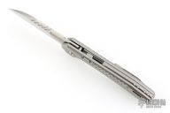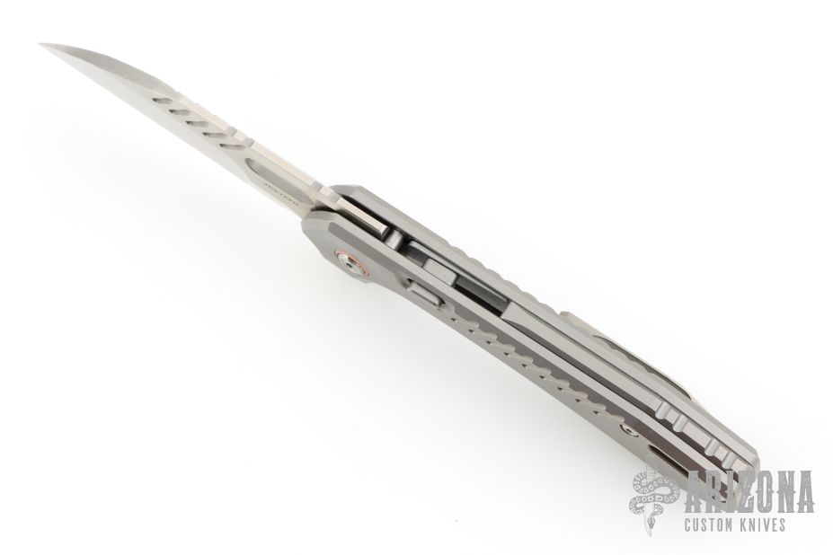 When the knife is in the closed position, the lock bar is almost completely hidden from view. The standalone stainless-steel plate is firmly secured in a milled pocket inside of the TC4 titanium handle, and it is further reinforced by a solid TC4 titanium backspacer.