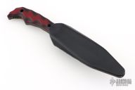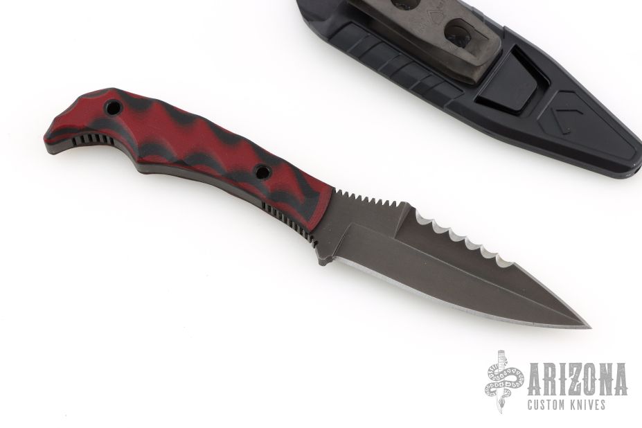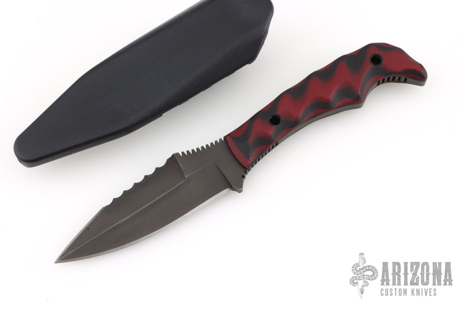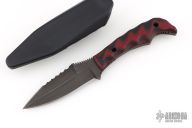 This Dynamis Razorback fixed blade was crafted by Winkler Knives. It features a black spear point blade with sharpened and serrated top edge and notched thumbrest, .182" blade stock and 1" blade depth. The handle has sculpted black/red G-10 scales over full tang construction. Jimping on pommel provides purchase when holding in the reverse grip. Includes a molded plastic sheath with metal clip. Includes the original box, sheath and papers. Excellent condition.