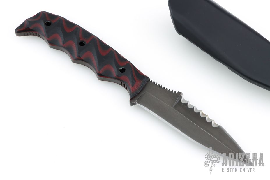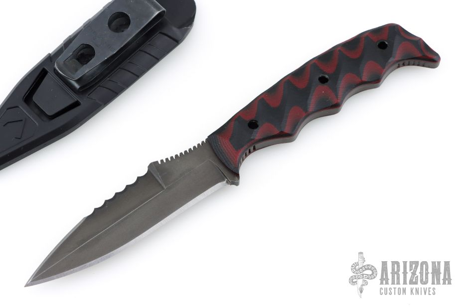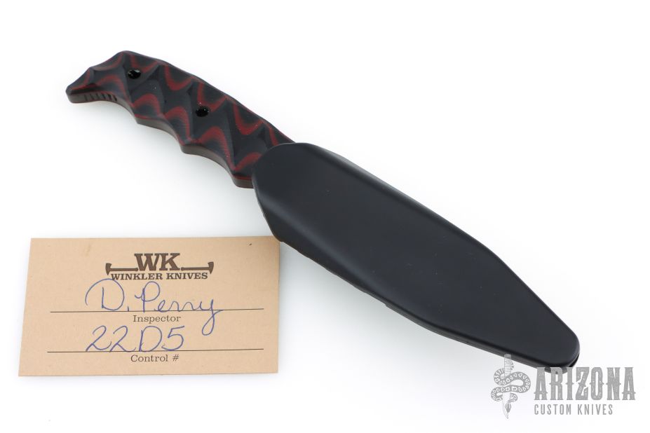 This Dynamis Revere fixed blade was crafted by Winkler Knives. It features a black spear point blade with sharpened and serrated top edge and notched thumbrest, .182" blade stock and 1" blade depth. The handle has sculpted black/red G-10 scales over full tang construction. Jimping on pommel provides purchase when holding in the reverse grip. Includes a molded plastic sheath with metal clip. Includes the original box, sheath and papers. Excellent condition.