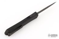 This Manticore-E by Heretic Knives features a double edged DLC tumbled full reverse serrated blade. The handle has a black aluminum frame with black G-10 button, DLC Ti hardware and tip down clip with ceramic ball inlay. Comes with original box and papers. S/N 008. Excellent condition.