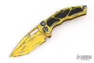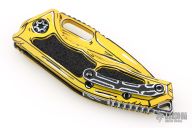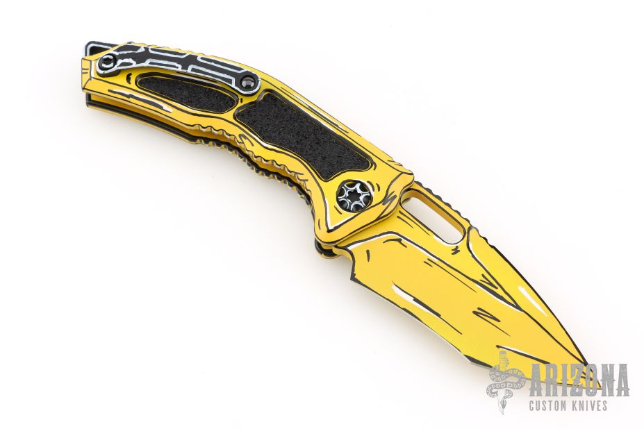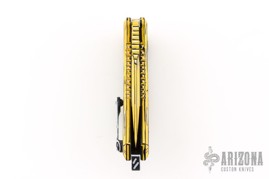 This Medusa by Heretic Knives features a yellow/white/black recurve tanto blade with false top edge, notched thumbrest. The handle has a yellow/white/black frame with checkered push button, black/white backspacer and matching tip up stainless steel clip with ceramic ball. Comes with original box and papers. dated 02/2025 s/n #451