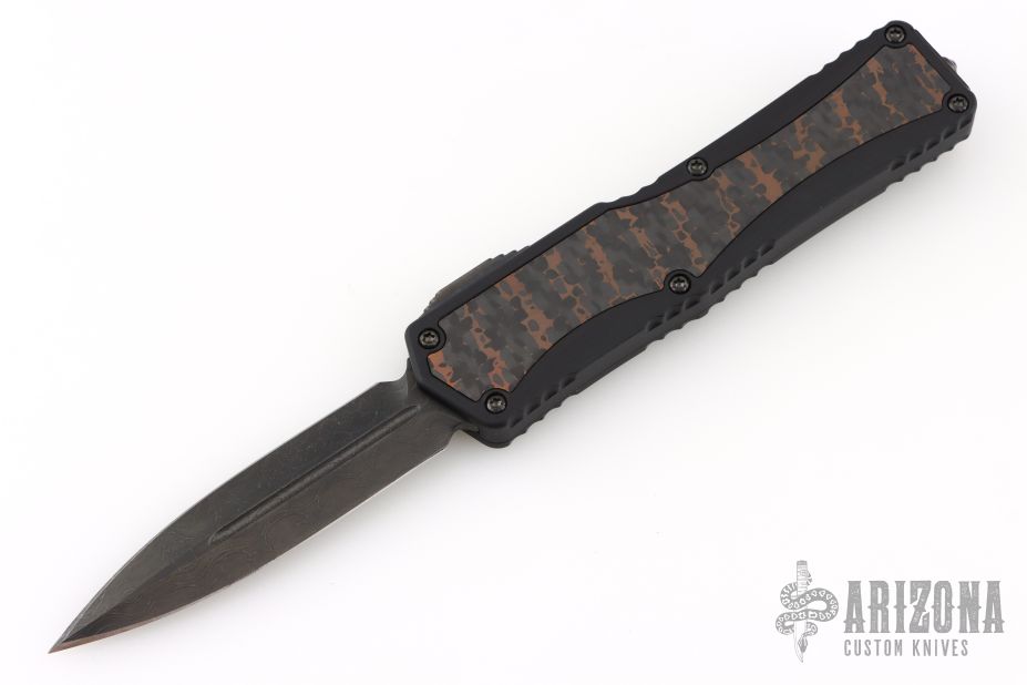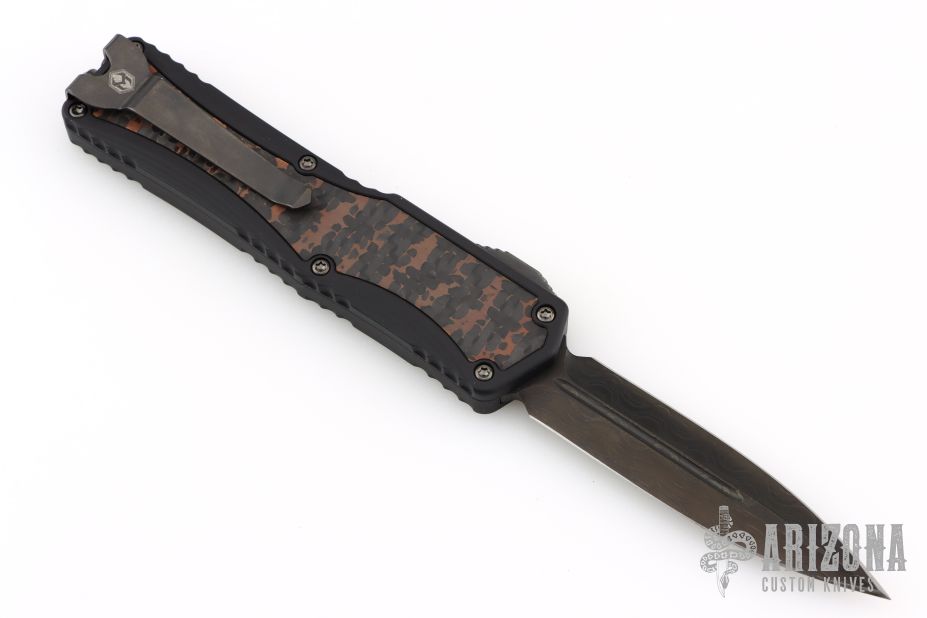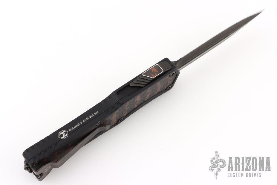 This Colossus by Heretic Knives features a double-edged Damascus blade with fullers.  The handle has a black aluminum frame with carbon fiber inlays, carbon fiber inlaid thumb slide, black stainless steel tip down clip. Comes with zippered case and box and COA.  S/N 009. Excellent condition.