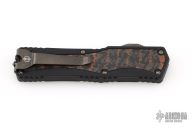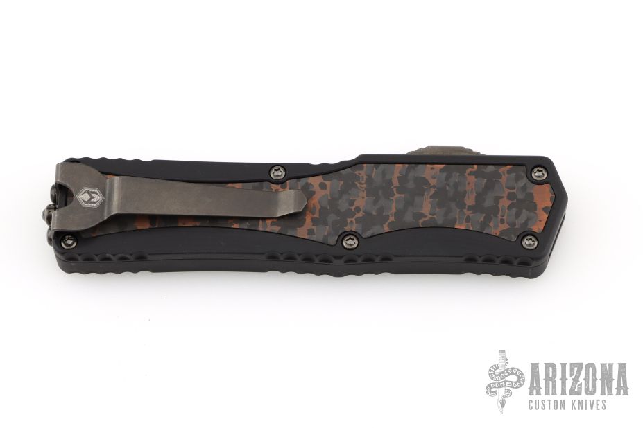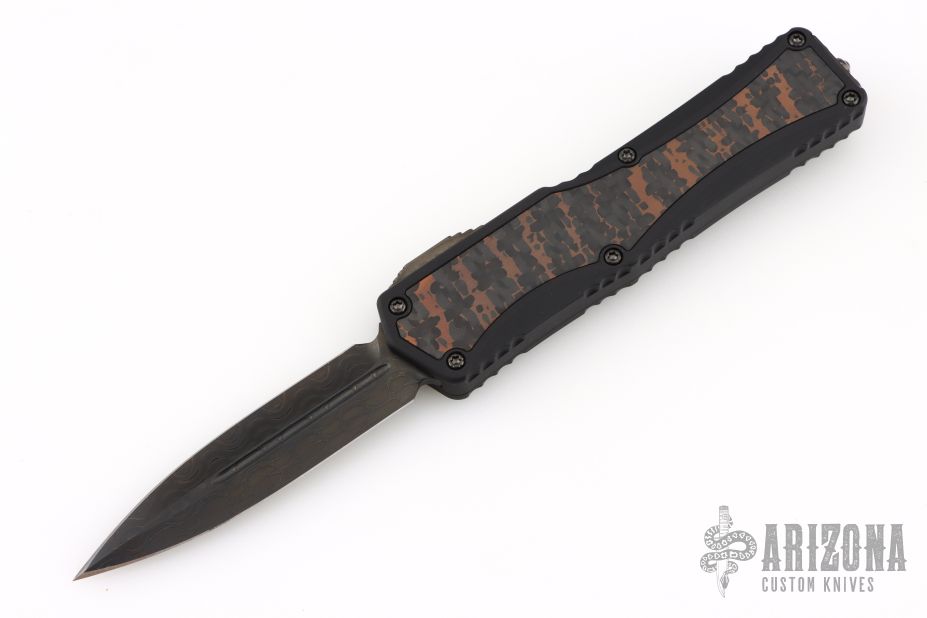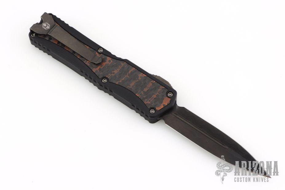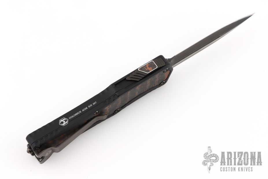 This Colossus by Heretic Knives features a double-edged Damascus blade with fullers.  The handle has a black aluminum frame with carbon fiber inlays, carbon fiber inlaid thumb slide, black stainless steel tip down clip. Comes with zippered case and box and COA.  S/N 007. Excellent condition.