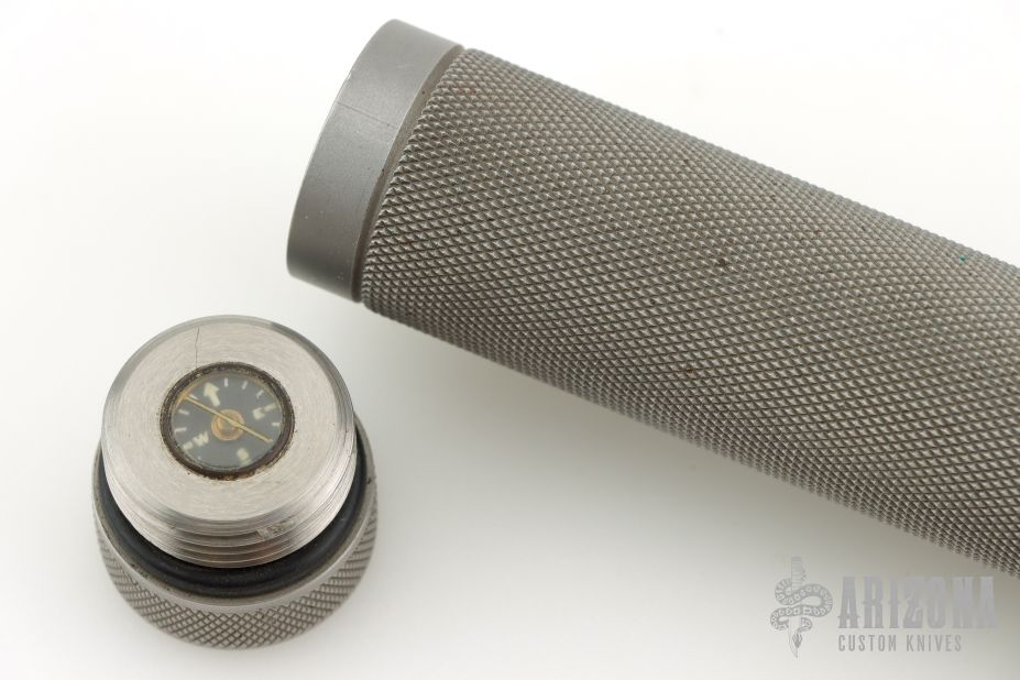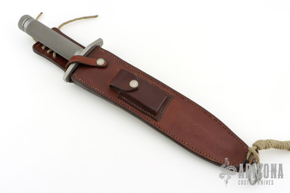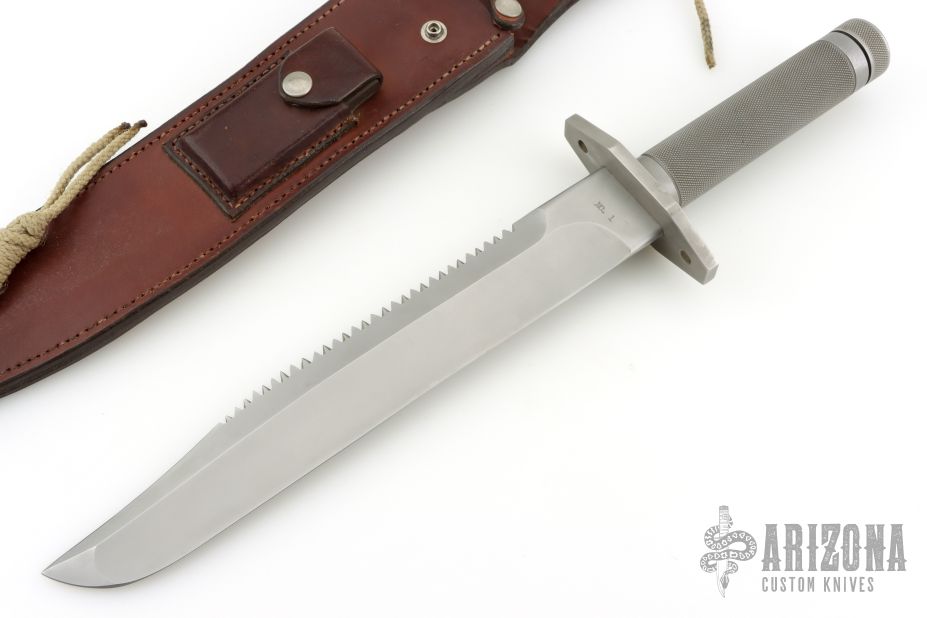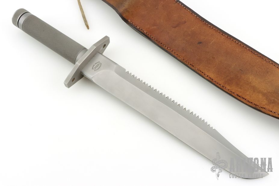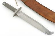 This Survival Bowie by Terry Miller features a bead blasted blade with sharpened clip and sawteeth on the spine, .240" blade stock and 1.641" blade depth, hollow handle construction. The handle has a bead blasted stainless steel guard with lashing holes, knurled stainless steel hollow handle and removable butt cap with compass. Has survival items in the handle: wire saw, 4 matches, fishing line, hooks, splitshot weights, two needles, thread. Coems with a brown leather sheath with sharpening stone. No. 1 on the blade. Has some light scuffs, otherwise excellent condition.