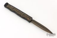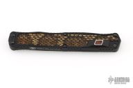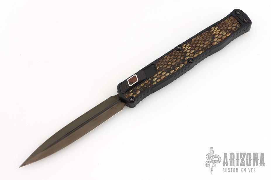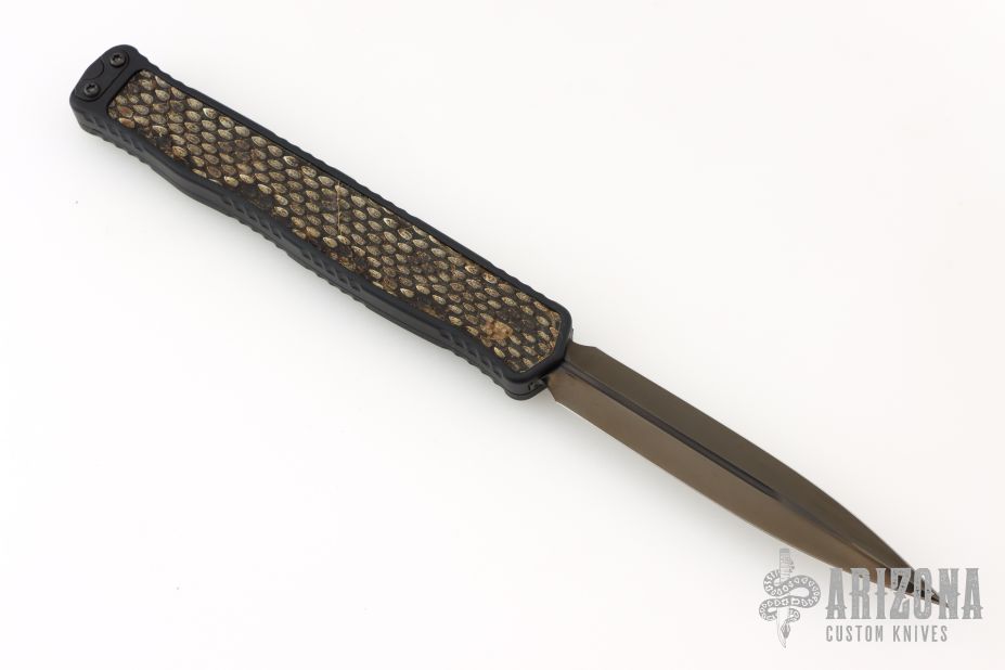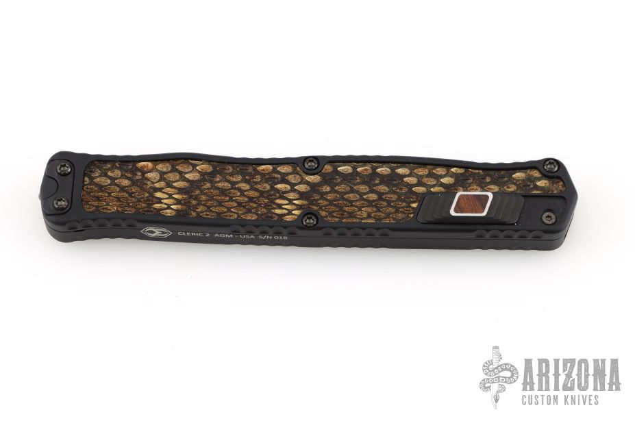 This Cleric II OTF by Heretic Knives features a hand ground DLC double edged  blade. The handle has a black aluminum frame with Eastern Diamondback Rattlesnake inlays, wood inlaid button, and DLC filler tabs. S/N 018. Comes with original box, zippered case and COA dated 03/25. Excellent condition.
