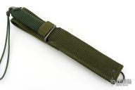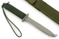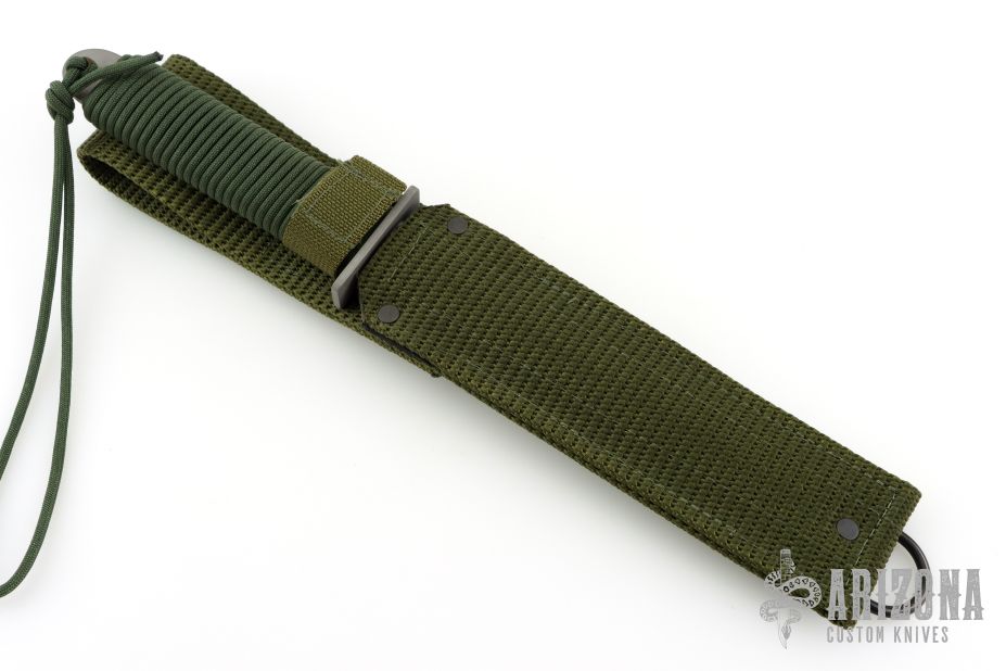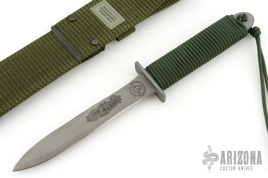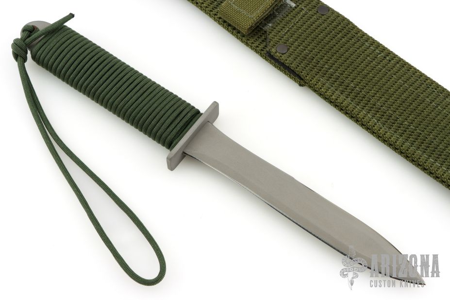 This PG-3W by EK Knives features a bead blasted blade with sharpened top edge, .148" blade stock and .985" blade depth, hidden tang construction. The handle has a bead blasted stainless steel guard and green paracord wrapped handle. Comes with original box and green nylon sheath. Has a couple light scuffs, otherwise excellent condition.