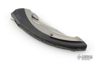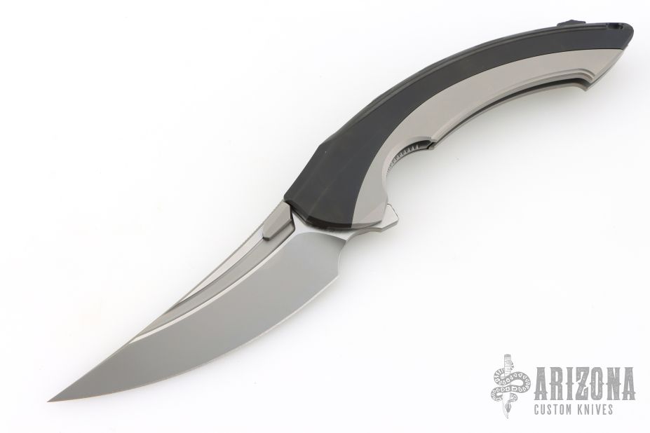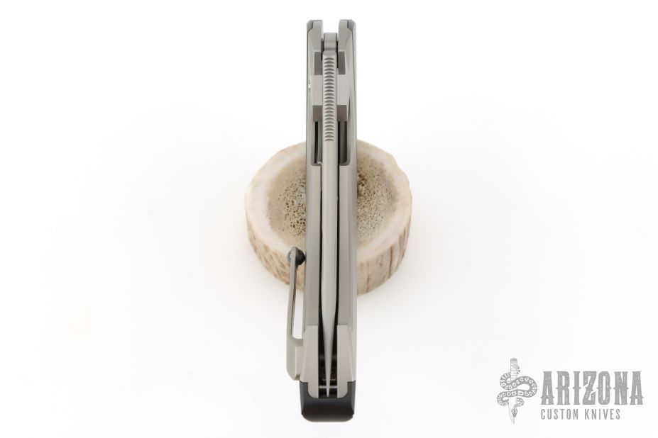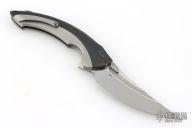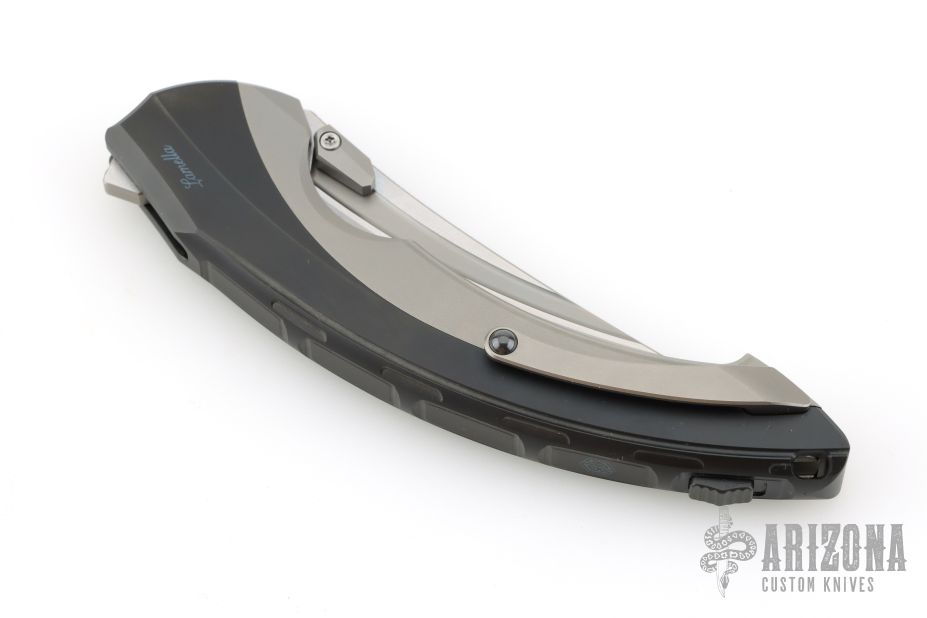 This Lamella by Rike features a two-tone blade with fullers, dual thumbstuds and a flipper. The handle has a titanium frame and liner, tip up clip with ceramic ball. Comes with original box and papers. Excellent condition.