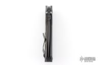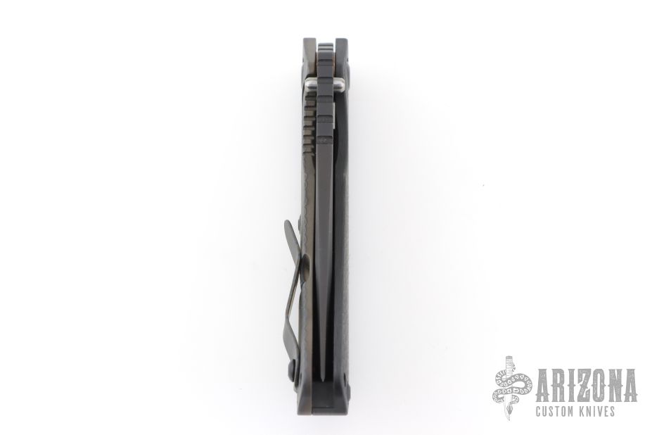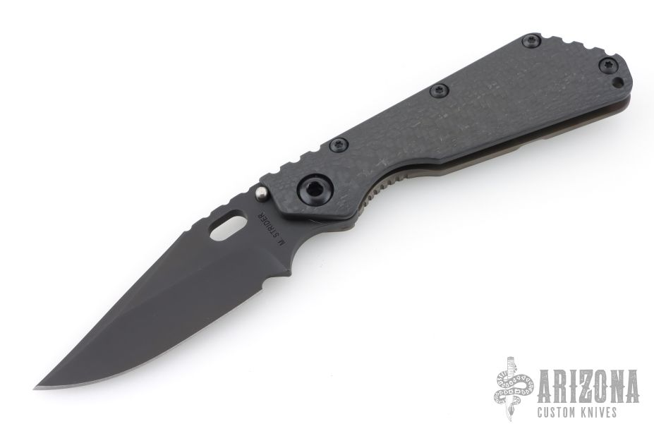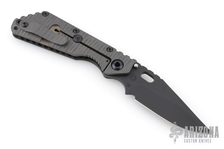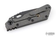 This Mick Strider SMF CC framelock folder features a black Bowie blade with thumbhole and notched thumbrest. The handle has a carbon fiber and flamed titanium frame with titanium clip, tip up carry, lockbar stabilizer. Jimping on blade spine. Nice lockup, detent, and blade seating. Excellent condition. Comes with a zippered case.