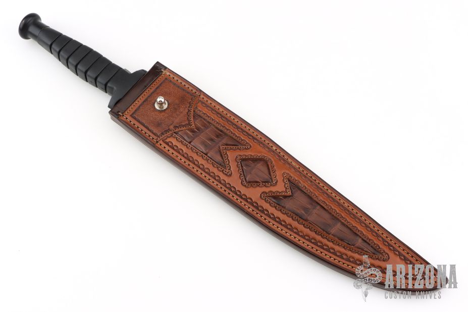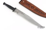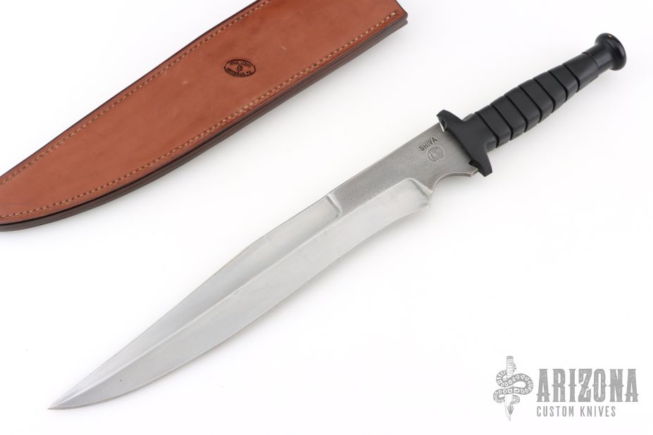 This knife by Shiva Ki features a double edged recurve Samurai Steel blade with hamon, .182" blade stock and 1.737" blade depth, hidden takedown tang construction. The handle has a black Kraton grip with black butt that unscrews to remove the handle. Comes with a custom brown leather sheath with alligator inlays by Paul Long. Has a couple light scratches, and two small dings in the top edge, has a split in the handle near the guard, otherwise excellent condition. Comes with a zippered case.