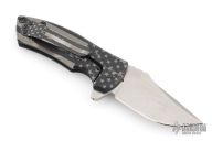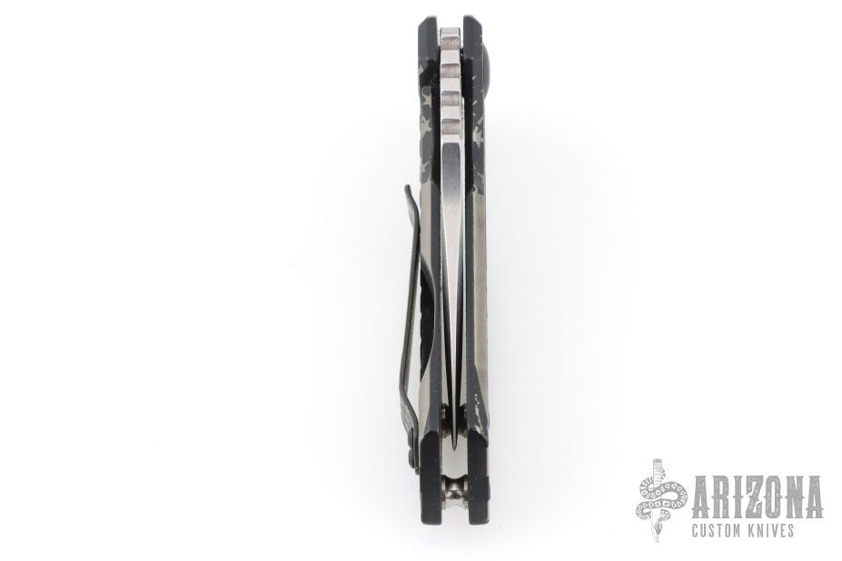This ESV Flipper by Les George features a tumble finished blade with notched thumbrest and a flipper. The handle has a titanium frame and titanium pocket clip for tip up carry. Smooth function with a lock up and nice detent. Excellent condition.